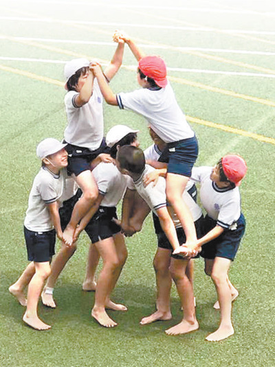 在日本东京一所小学的春季运动会上,学生们正在进行叠罗汉项目比拼。(图源:人民日报)