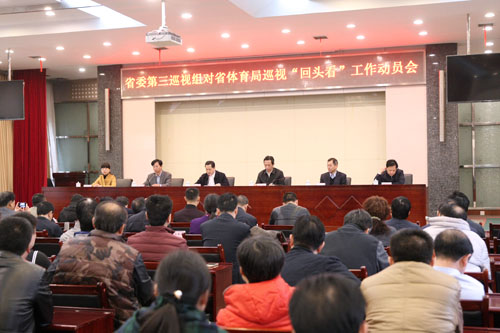 根据省委关于巡视工作的统一部署,2月18日,省委第三巡视组对省体育局开展巡视“回头看”工作动员会召开。省委组织部部务委员、省委巡视工作领导小组成员梁平传达了中央、省委关于巡视工作的新精神,并就配合做好巡视工作提出要求,省委第三巡视组组长张泽军作了动员讲话,省体育局党组书记、局长李舜主持会议并作了表态发言。