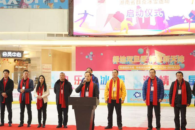 湖南省体育局副局长苏健全宣布了第四届全国大众冰雪季暨湖南省群众冰雪运动系列活动正式启动。长沙市体育局副局长覃事平、湖南体育产业集团有限公司总经理陈彬,湖南省体育局群体处副处长张志朝、湖南省体育局群体处副处长何创福、长沙市体育局群体处处长殷建军等领导及嘉宾出席了启动仪式现场。