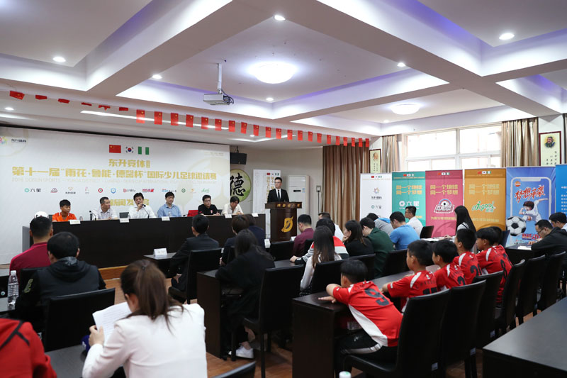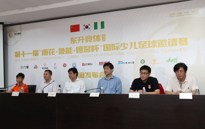 (4月12日,东升竞体2018第十一届 “雨花·鲁能·德馨杯”国际少儿足球邀请赛新闻发布会在长沙召开。)