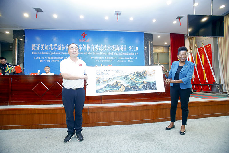湖南省体育局副局长熊倪(左)向牙买加国家队来华训练总领队泰勒.罗伯特(右)赠送礼物。