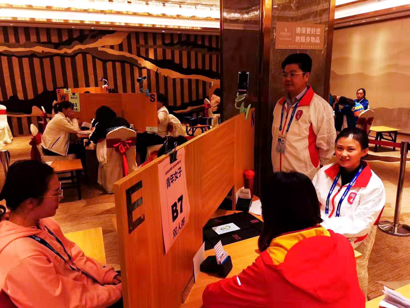 (图为湖南选手王钰扬(左一)和练丹红(右边白衣服者)在桥牌项目比赛中。)