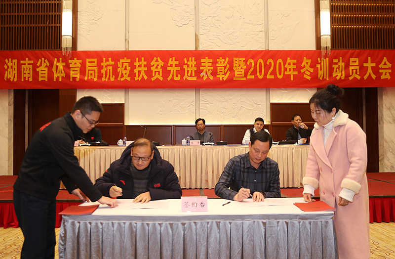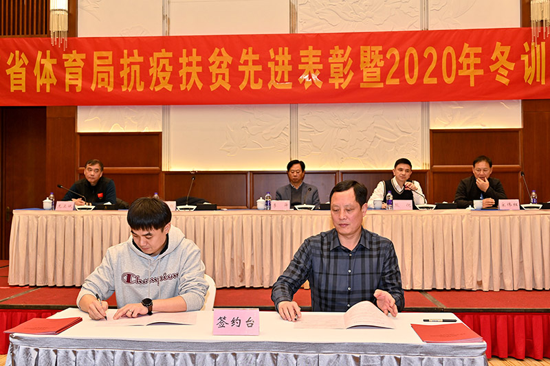 (图为龚旭红副局长与水上中心、举重中心等9家训练单位负责人签订目标任务书。)