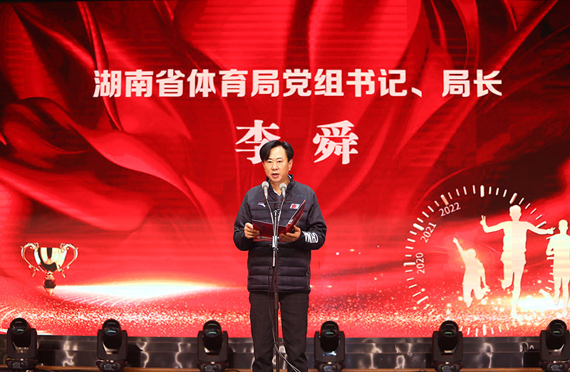颁奖晚会上,李舜首先在致辞中表示,2020年是极不平凡的一年,全省体育系统在省委省政府的坚强领导下,积极应对新冠肺炎疫情的影响,以高昂的斗争精神、必胜的决心信心,努力推动湖南体育高质量发展,在构建湖南体育新发展格局中展现新作为:一是持续推进健康湖南全民健身行动,努力构建全民健身公共服务体系,人民群众的幸福感、获得感不断提升;二是狠抓体能训练,全年共获得26个全国冠军,为备战工作奠定了坚实基础;三是深化体教融合,积极探索建立体教两家纵向、横向相互贯通的体育后备人才培养网络;四是着力以典型示范提升体育产业发展速度,在省市共同发力推动体育产业高质量发展方面迈出了可喜步伐;五是大力实施体育文化工程,组织开展《湘军风采》《聚焦体育湘军·冲刺2021》等系列报道,深入挖掘“体育湘军”展现的湖湘精神内涵,以体育文化感动大众、激发热情。