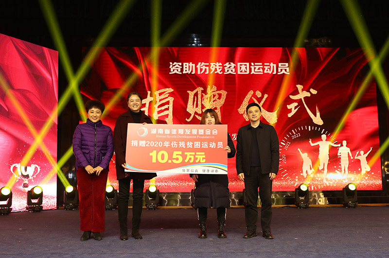 最后,熊倪副局长、省体育人才交流服务中心主任雷小峰、湖南省体育发展基金会秘书长祁小红共同为伤残贫困运动员颁授10.5万元资助金。同时,湖南省体育发展基金会理事长谭鸥、副理事长谢怡还为优秀运动员、优秀教练员标兵颁授10万元奖金,舒华体育股份有限公司湖南运营中心总经理何雄辉为优秀运动员、教练员标兵捐赠10套运动器材。