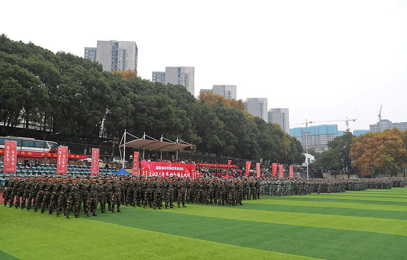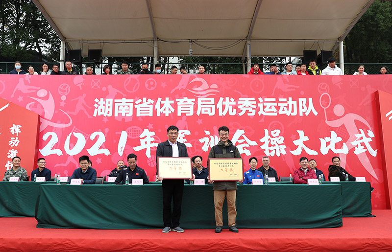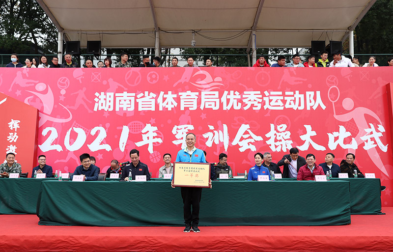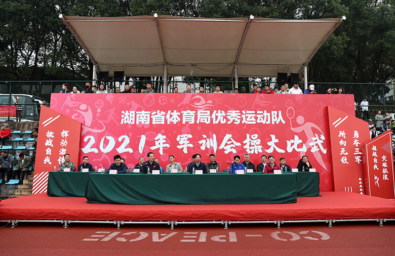 2021年11月20日上午,湖南省体育局优秀运动队军训会操大比武在湖南体育职业学院隆重举行。湖南省体育局党组书记李舜,湖南省体育局局长罗双全,湖南省体育局党组成员、副局长龚旭红,湖南体育职业学院党委书记周志宏、院长谭焱良出席活动并为获奖团体颁奖。出席活动的还有,长沙市警备区军训会操评委、各中心班子成员,全体运动员、教练员等相关人员。