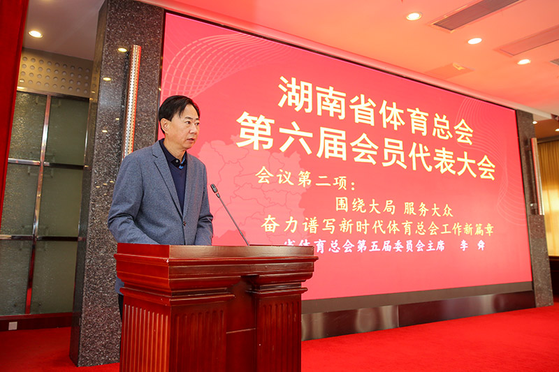 12月7日,湖南省体育总会第六届会员代表大会召开。大会审议通过省体育总会第五届委员会所作的工作报告,修订了《湖南省体育总会章程》,选举产生了省体育总会第六届委员会,省体育局党组书记李舜当选主席,省体育局党组成员、副局长罗跃龙等18名同志当选为副主席,省体育局二级巡视员王晃当选专职副主席兼秘书长。湖南省民政厅副厅长张自银,省体育局局长罗双全,省体育局党组副书记、副局长熊倪,省体育局党组成员、省纪委监委驻省体育局纪检监察组组长刘新华,一级巡视员杨再辉、宋伟红等出席了会议。省、市、县体育行政部门和体育总会相关负责人,省直有关单位相关处室负责人,省级体育单项协会和体育俱乐部代表,优秀运动员代表,基层体育工作者代表(优秀基层教练、优秀社会体育指导员),体育产业领域的优秀代表,积极参与并给予体育事业支持的企业界代表,省内高校体育学院、中学体育部负责人代表共139人当选为湖南省体育总会第六届委员会委员。