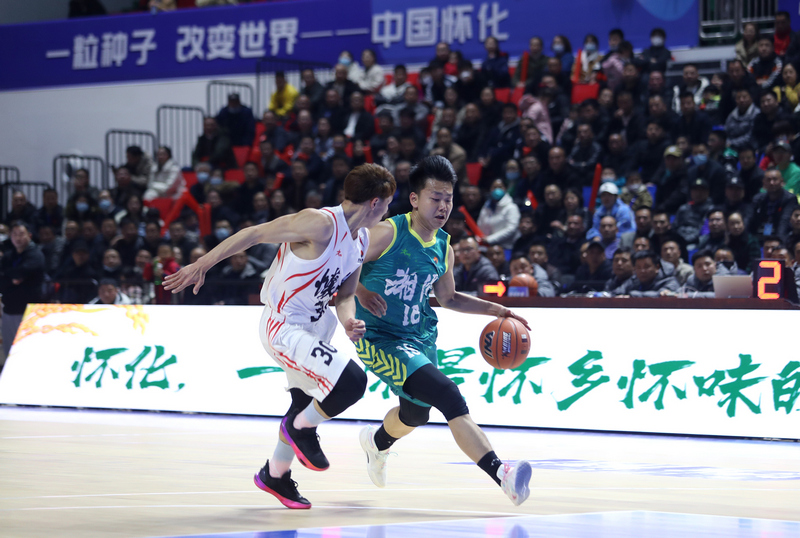 图为揭幕战怀化辰溪队(白衣)和湘潭湘钢(绿衣)比赛精彩瞬间。