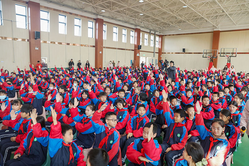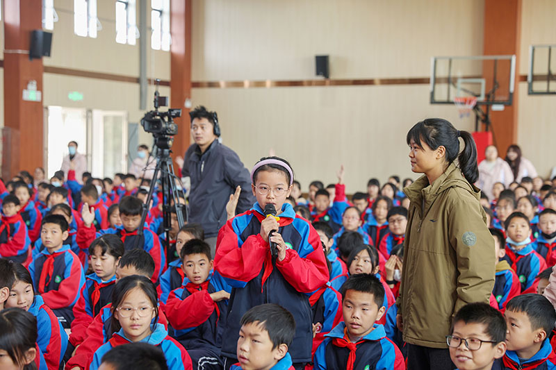 为了让同学们了解更多的体育知识,并与体育明星们深入互动,活动现场进行了体育知识抢答赛,回答正确的同学获得了由龙清泉和李晓璐签名的纪念球衣一件。“奥运五环是哪五种颜色?”“被誉为中国‘国球’的体育项目是什么?”……同学们纷纷举手、积极抢答,现场氛围热闹活泼。
