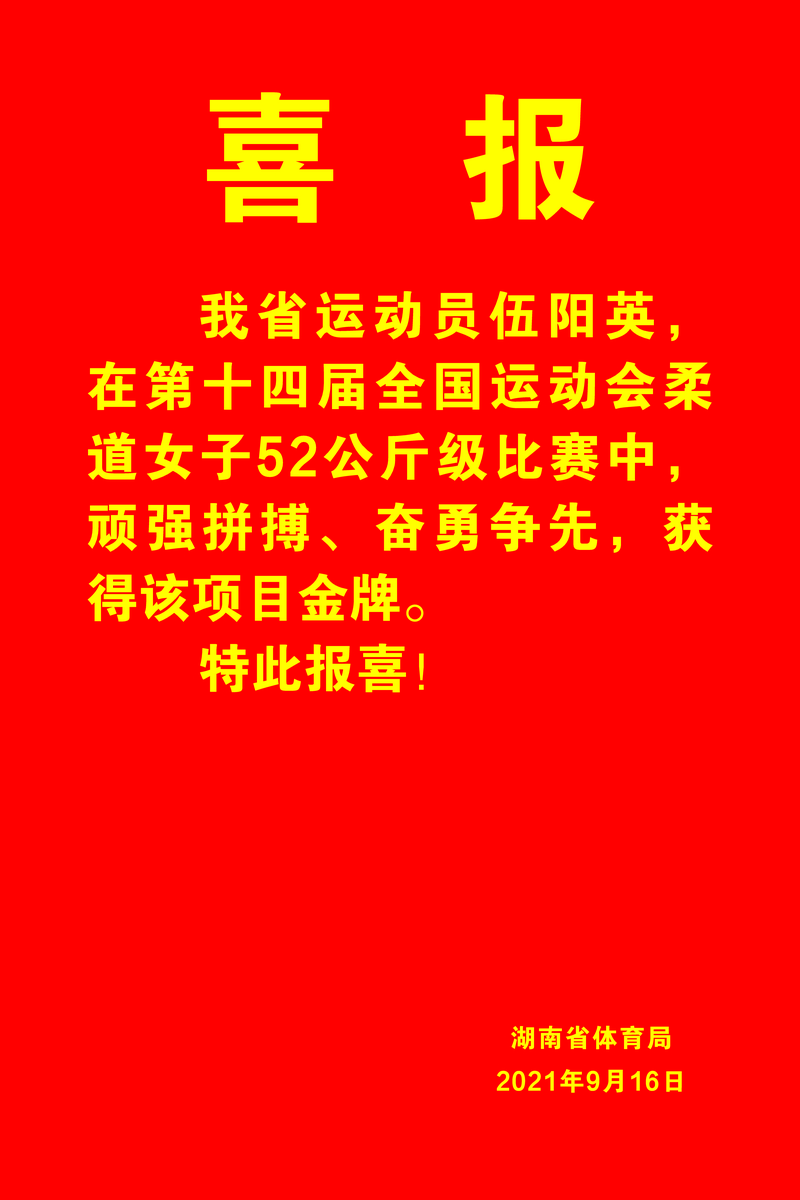 9月16日,在小将刘亭拿下女子柔道48公斤级冠军后,湖南队老将伍阳英也紧随其后的拿下第十四届全国运动会柔道女子52公斤级冠军。