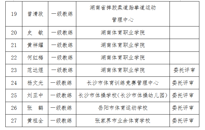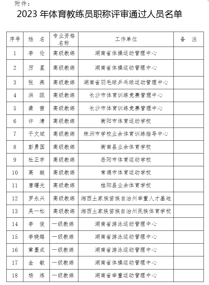 2023年11月9日,湖南省体育教练员系列高级职称评审委员会评审通过李伦等13人高级教练员职称和李俊等14人一级教练员职称(名单附后),现予以公示,公示时间为2023年11月10-16日。公示期间如对公示对象的职称评审有异议,可通过电话或书面形式向湖南省体育局职改办反映。以个人名义反映情况的需实名,并注明联系方式,以单位名义反映情况的需加盖本单位公章。反映情况要坚持实事求是的原则,以便调查核实。