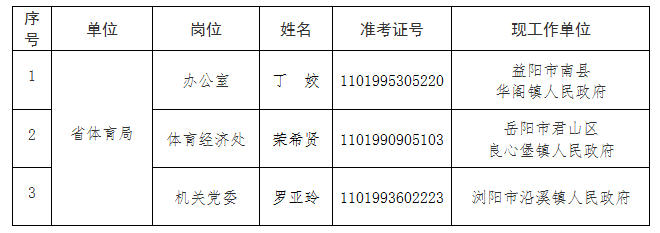 根据《2025年度湖南省省直机关公开遴选公务员公告》有关规定,经笔试、面试、体检、考察、局党组集体研究等程序,确定丁姣、荣希贤、罗亚玲3名同志为省体育局拟遴选对象,现予以公示。