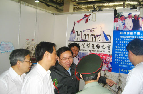 5月15日,2011年湖南科技活动周暨第四届湖南科技博览会在长沙红星会展中心拉开了帷幕。有食品、电视、出版、建筑等各行各业共79家单位和企业参加了此次展览。成百上千例科技和创意以“携手创造新型国家”为主题尽显我省科技魅力。湖南省体育模型和摩托艇运动管理中心(前身:湘潭航海运动学校)也积极参加本次活动,在开幕式上给观众呈现了一场精彩纷呈的飞机模型表演,成为本次活动的一大亮点和特色,吸引了不少观众的眼球,省委副书记梅克葆等领导兴致勃勃地与队员进行互动,省体育局副局长李贵应邀出席。