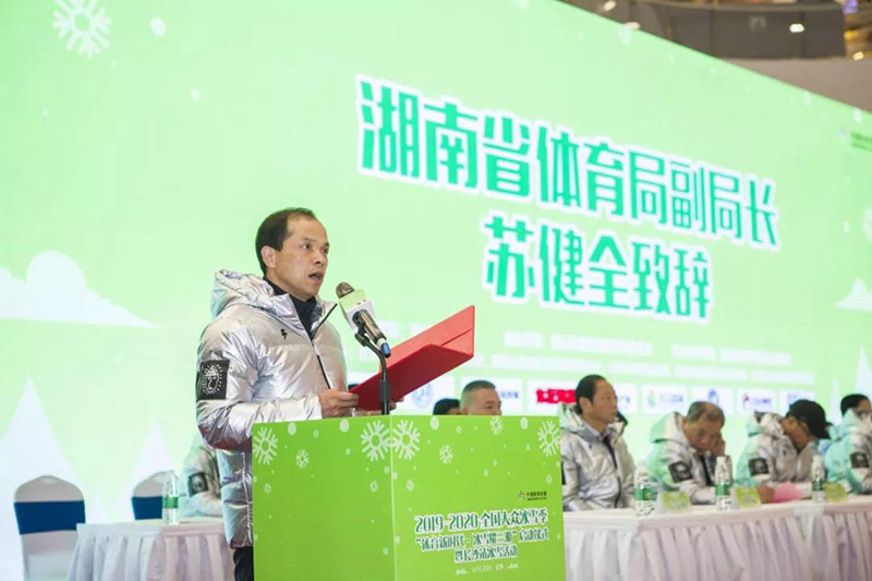 在启动仪式上,苏健全副局长发表了热情洋溢的讲话。他总结了近年来湖南作为国家“北冰南展”战略实施的重要省份取得的成绩,他希望全省各界积极行动起来,以此次活动为契机,厚植冰雪文化、浓厚冰雪氛围,带动冬季全民健身运动在三湘大地的蓬勃发展,实现我省冰雪运动跨越式发展,助力北京冬奥会。
