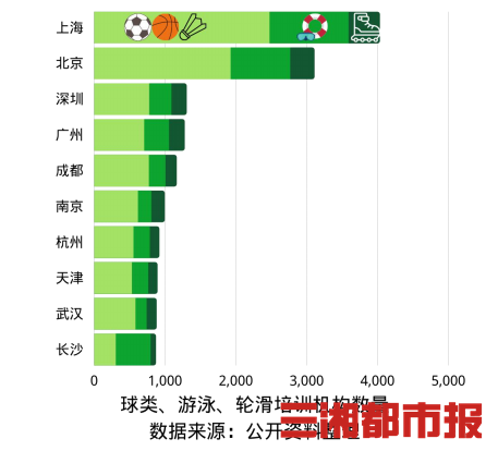 记者注意到,《中国城市体育消费报告》对球类、游泳、轮滑培训机构数量的整理数据显示,长沙在30个城市中排名第10,位于上海、北京、深圳、广州、成都、南京、杭州、天津、武汉等城市之后。公开数据显示,长沙目前拥有的近千家上述培训机构中,游泳培训机构最多,其次为球类,再次为轮滑。