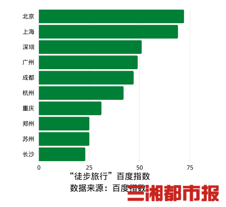 近年来,湖南每年都会进行“走红军走过的路”徒步穿越系列活动、湖南百公里等数个品牌徒步活动,在《报告》统计的30个城市中,长沙在徒步旅行指数上排名第10。