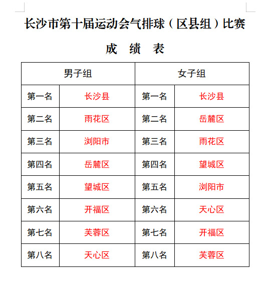 经过一天半的激烈角逐,在一次次的尖叫和加油声中,比赛结束了!最终男子组第一名:长沙县;第二名:雨花区;第三名:浏阳市。获得女子组第一名:长沙县;第二名:岳麓区;第三名:雨花区。