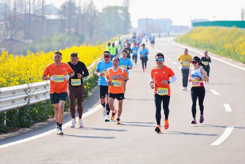 春日的南县罗文村,金黄的油菜花海与湛蓝的天空交相辉映,3500名跑友身着赛事专属蓝色参赛服,如一条“流动的洞庭湖”蜿蜒于花田之间。参赛服设计别具匠心,以“南县文旅地图”为灵感,将罗文涂鸦村、三仙湖水库等标志性景点融入图案,成为“穿在身上的南县名片”。赛道全程贯穿万亩油菜花田、涂鸦艺术村与湖区生态景观,选手们从洞庭之心广场出发,途经藕池东支大堤、三仙湖水库等地标,在奔跑中感受“天地一色”的辽阔意境。