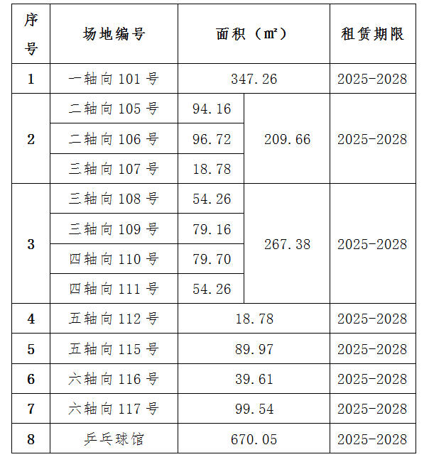 每年租金按中标价的1%递增,4、5、6、7号标的可以与其他标的合并租赁,合计场地面积享受相应租金最低标准。