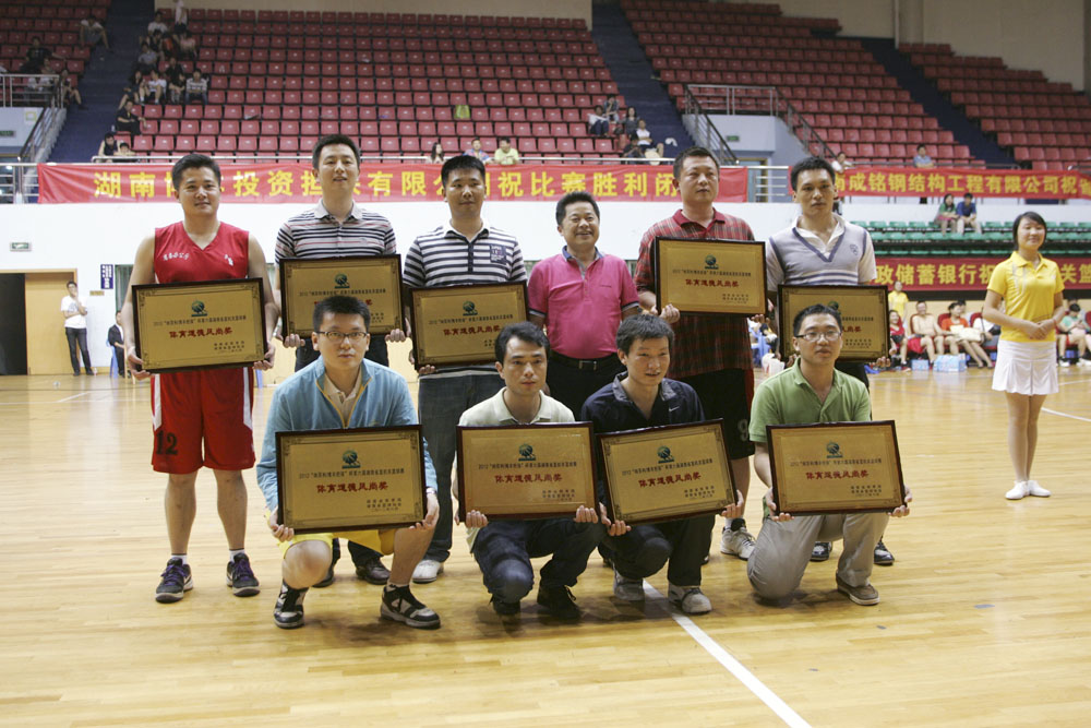 图为湖南省篮球协会副主席、省委办公厅副主任、省档案局党组书记黄赤清(右四)获得本次比赛企业一等奖的单位颁奖并合影留念。