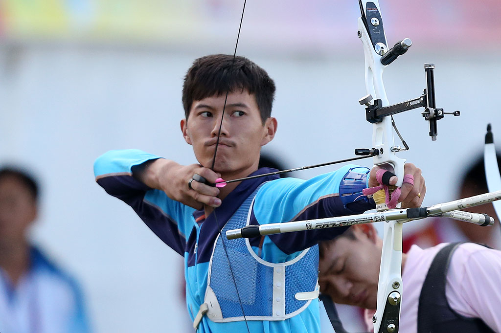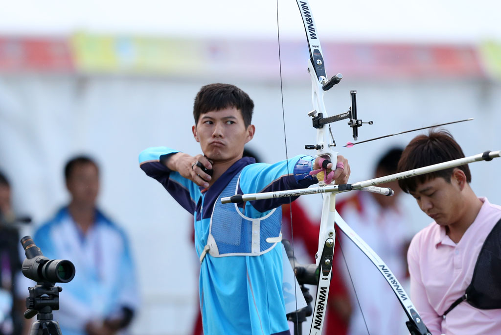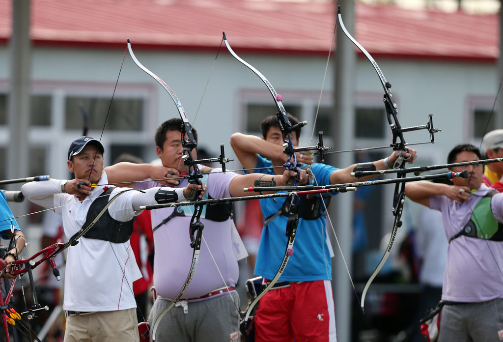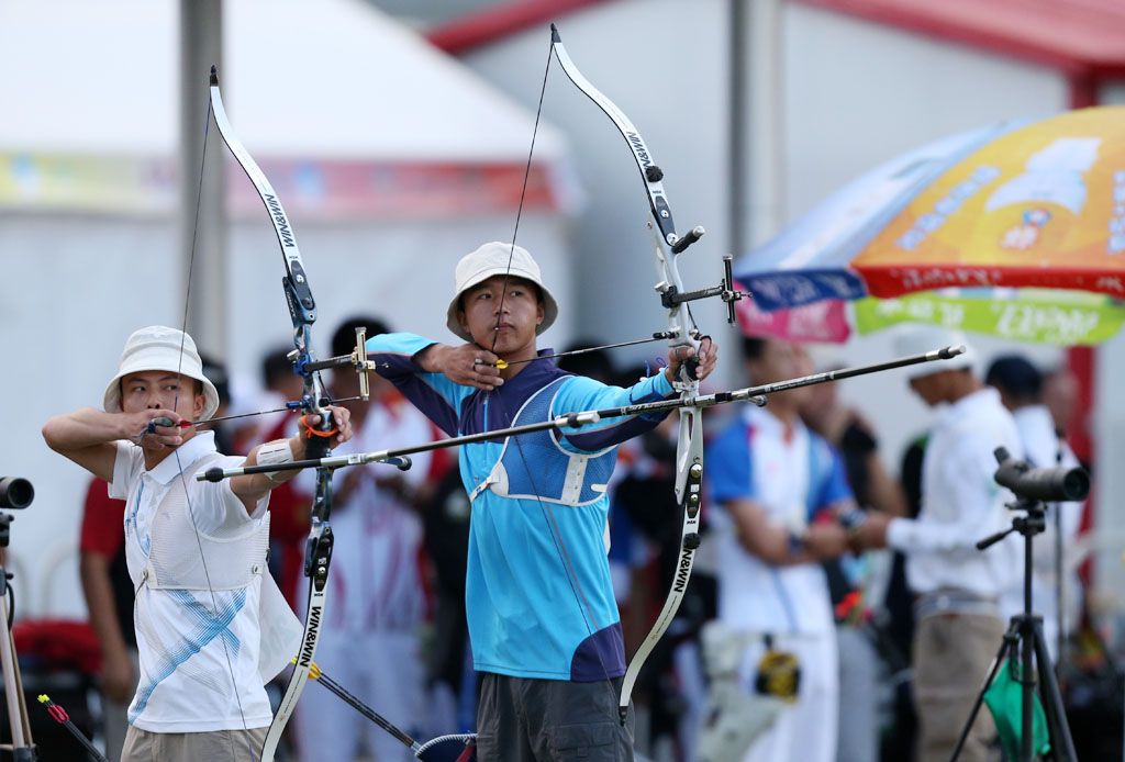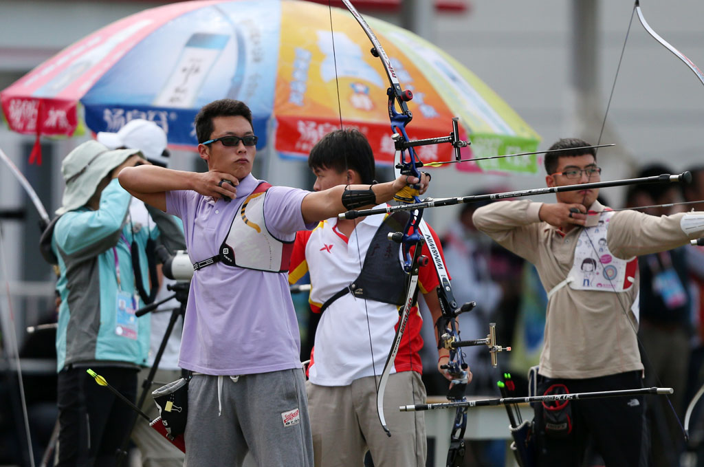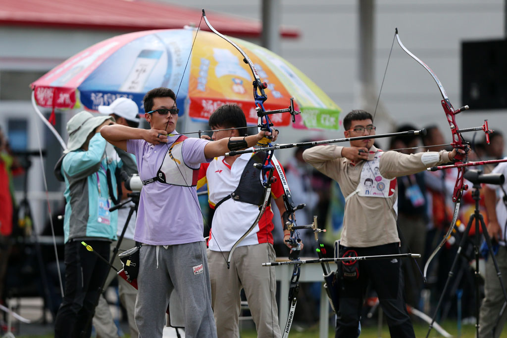 图为2日进行的男子射箭个人排名赛精彩瞬间。