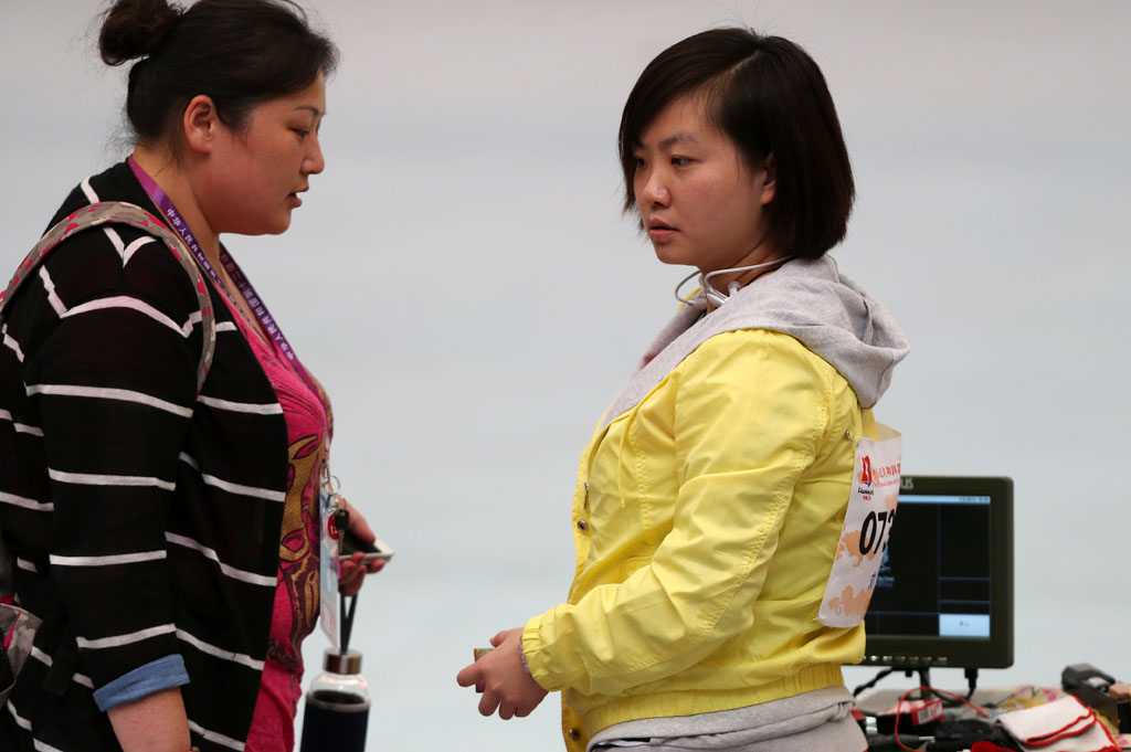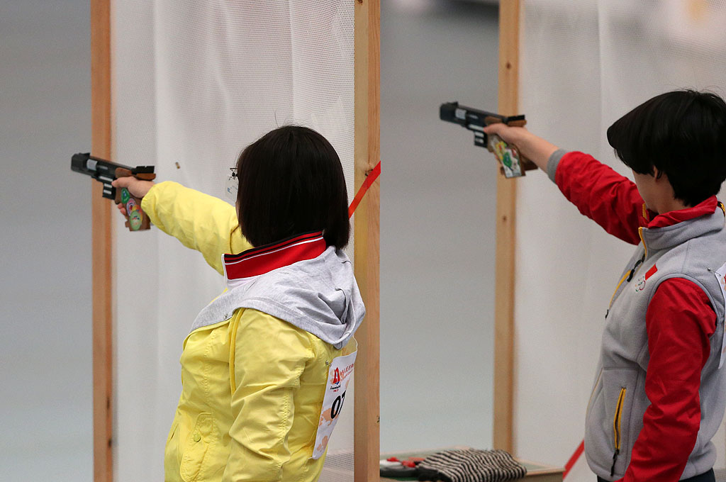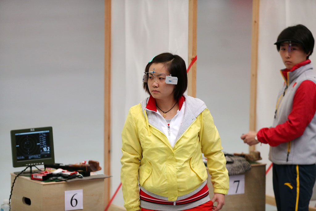 图为湖南选手刘艳(左)在女子25米运动手枪比赛中。