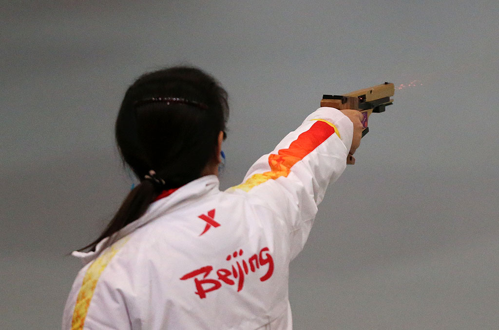 图为女子25米运动手枪冠军获得者北京选手陈颖在比赛中。