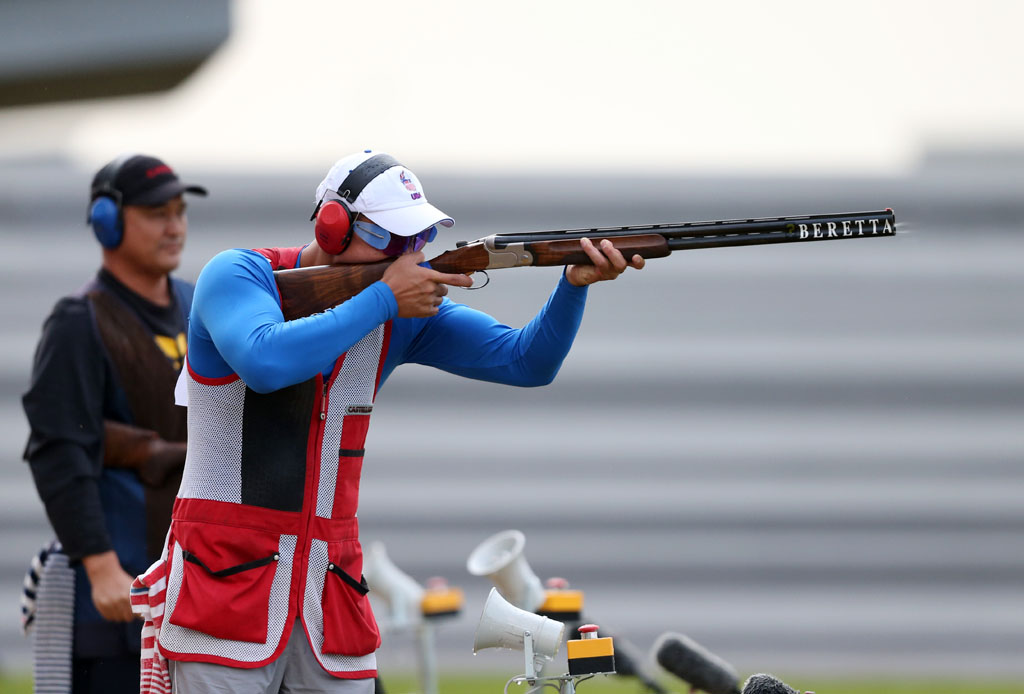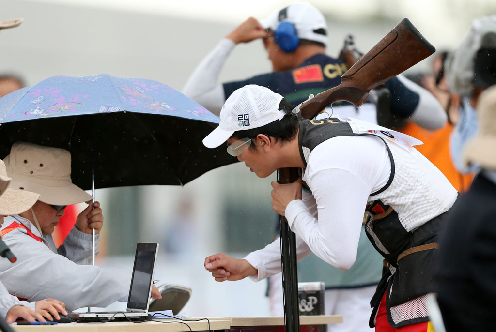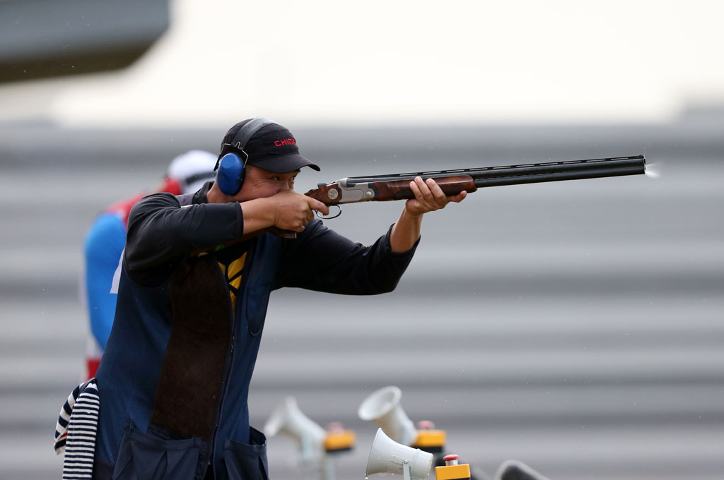 图为男子飞碟多向冠军获得者山东选手张永杰在比赛中。