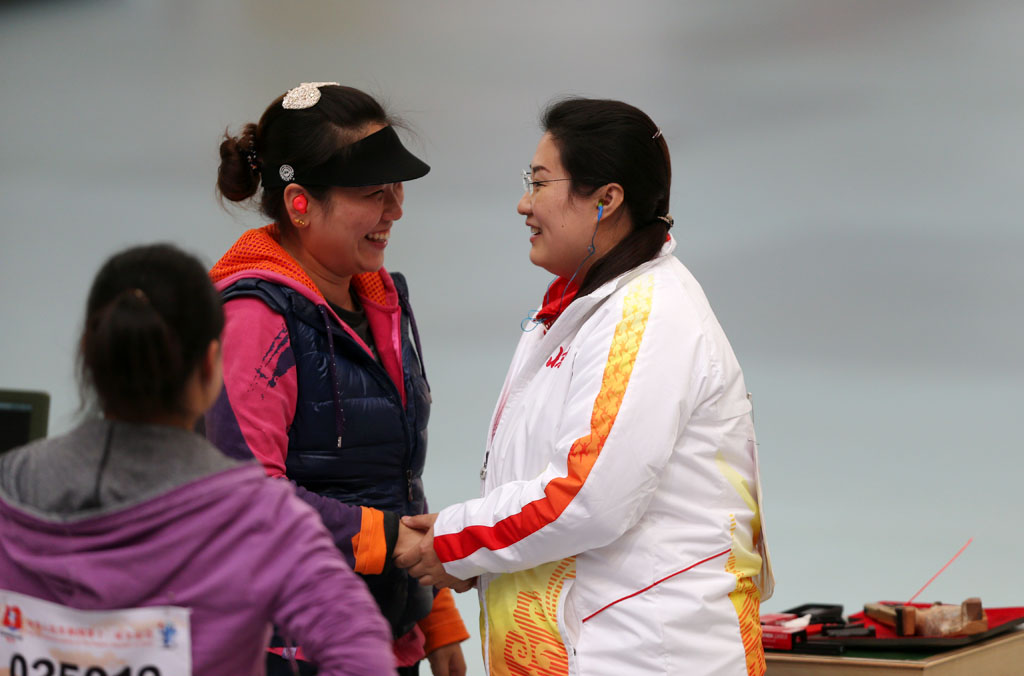 图为女子25米运动手枪冠军获得者北京选手陈颖(右)与对手相互祝贺。