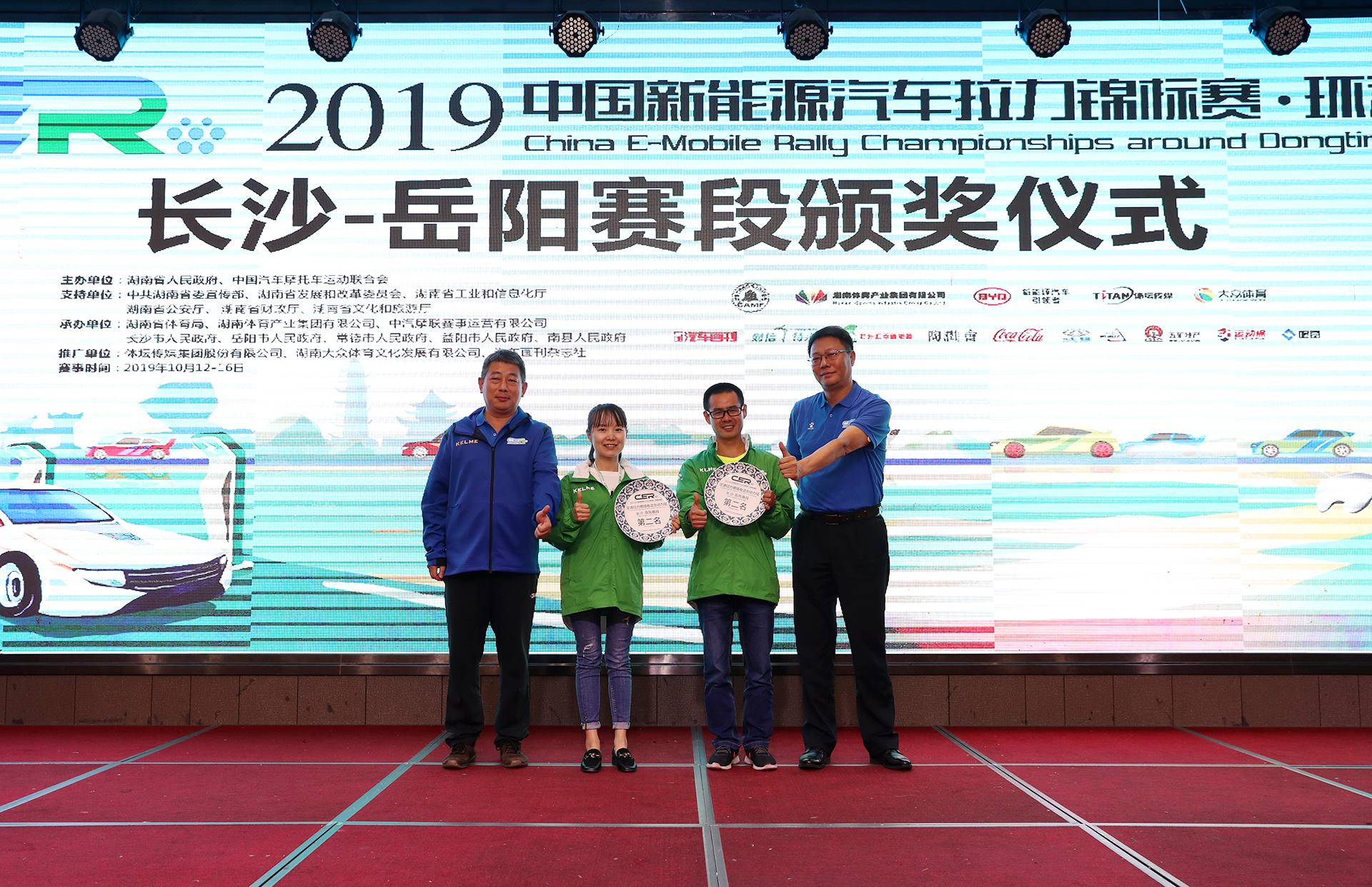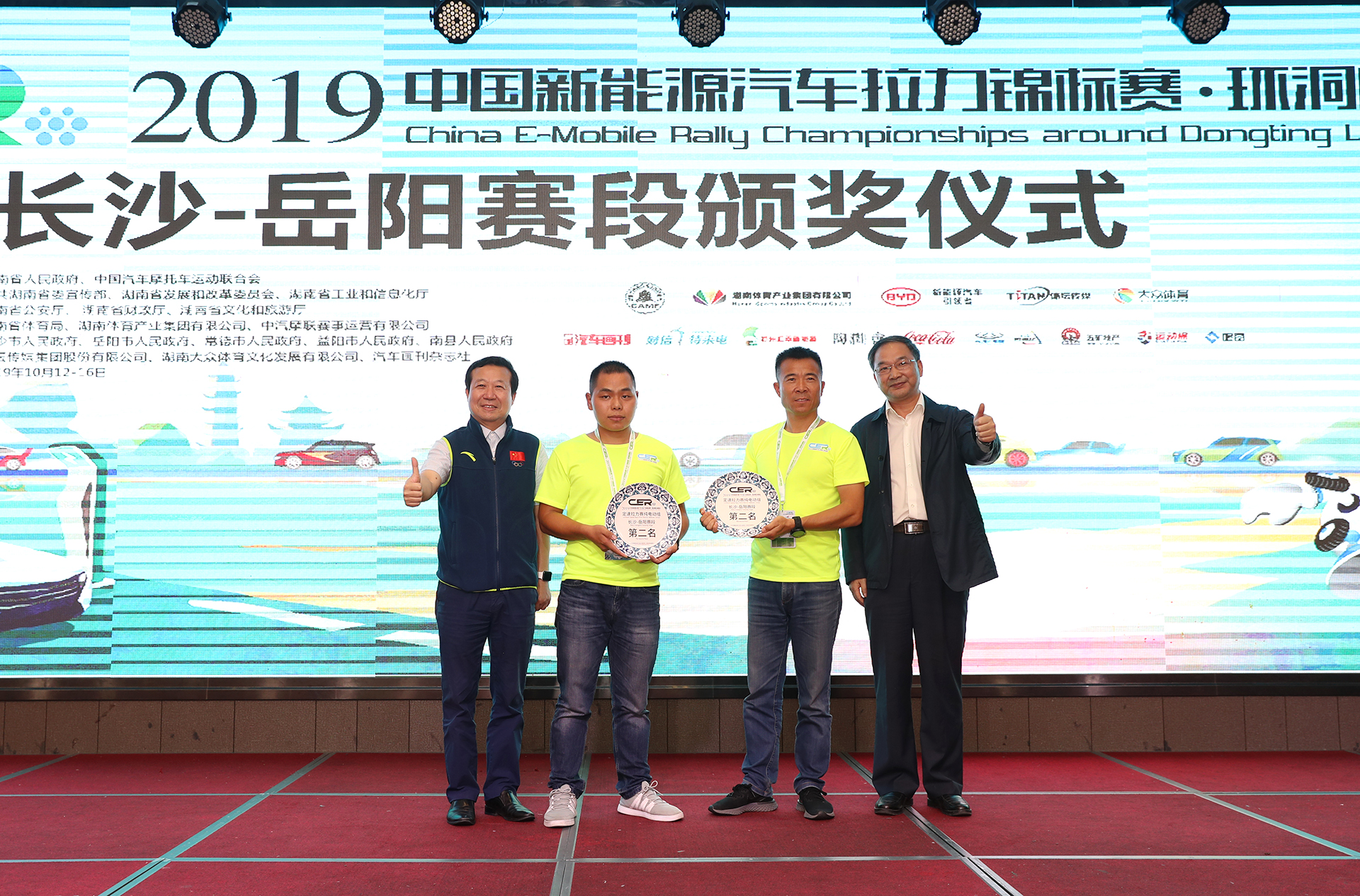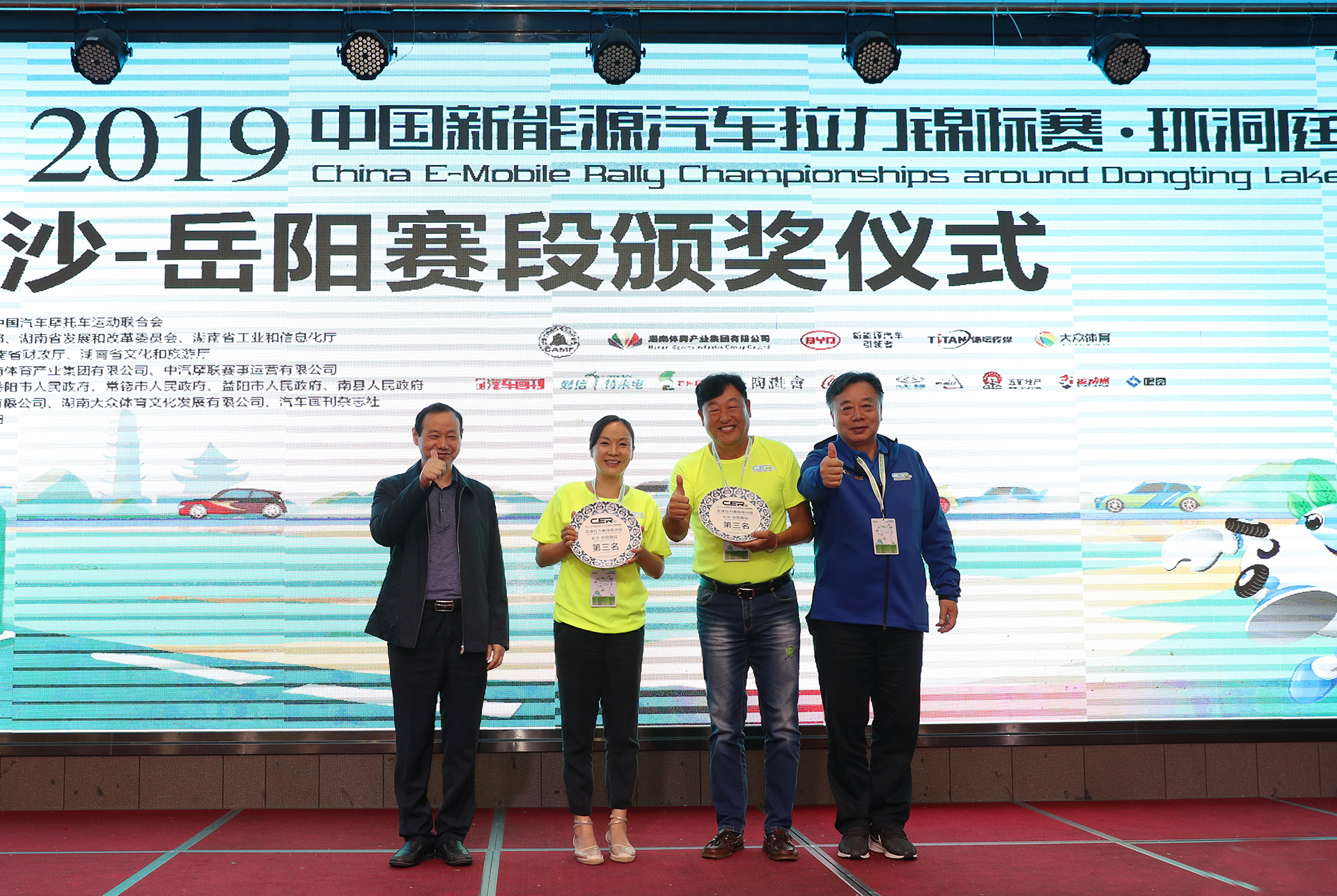 图为长沙至岳阳赛段定速拉力赛混合动力组亚军选手与颁奖嘉宾合影留念。