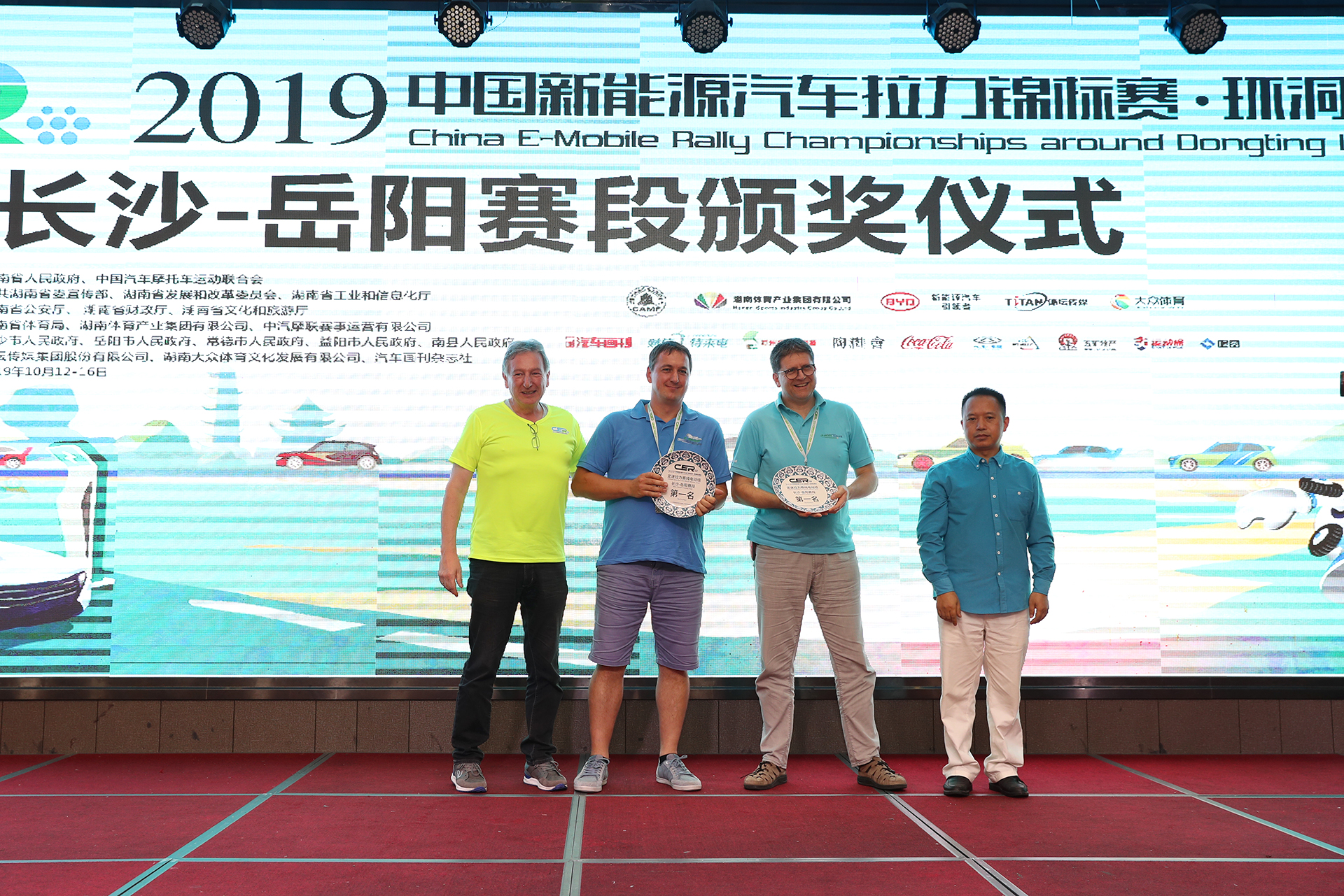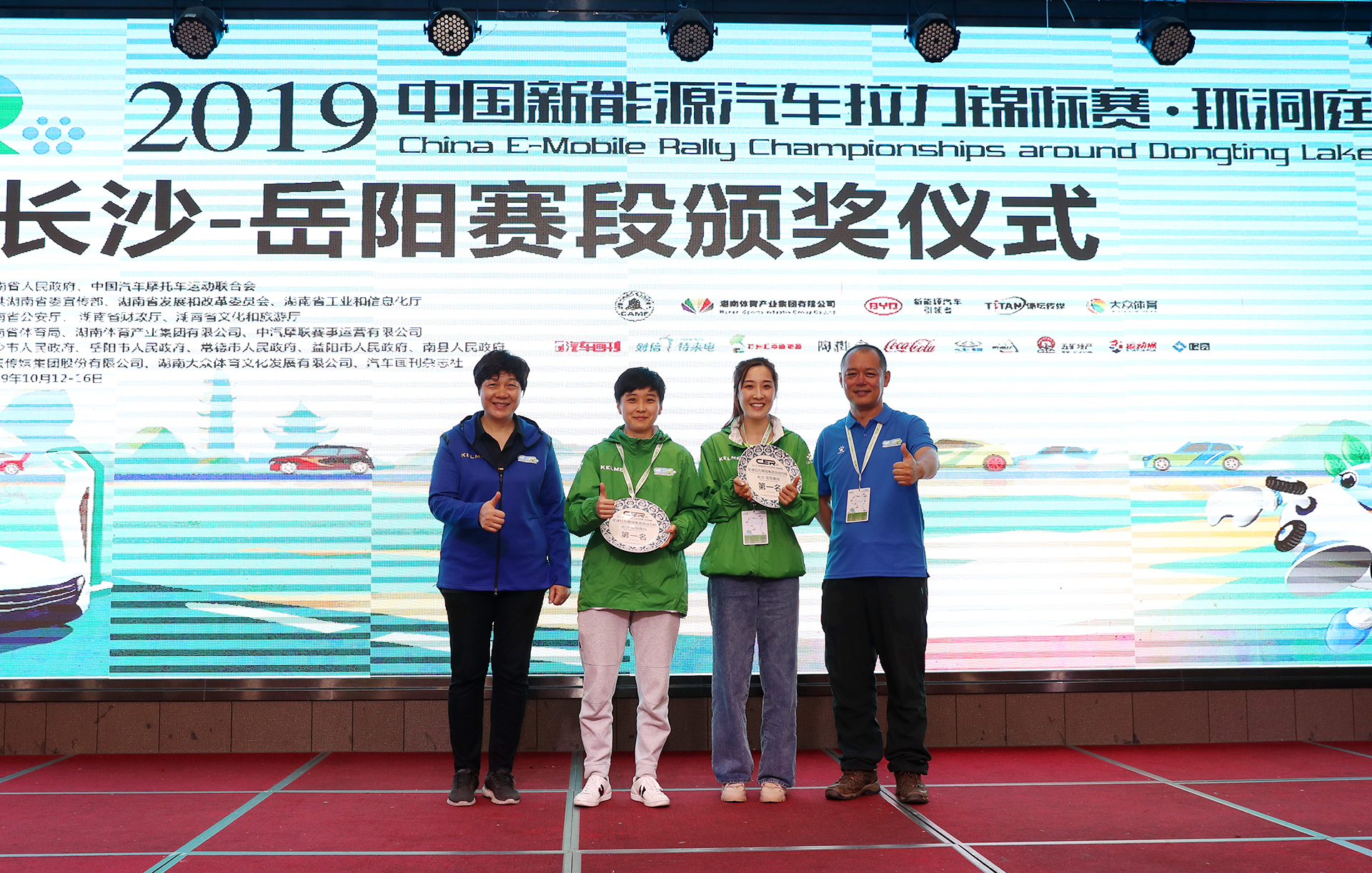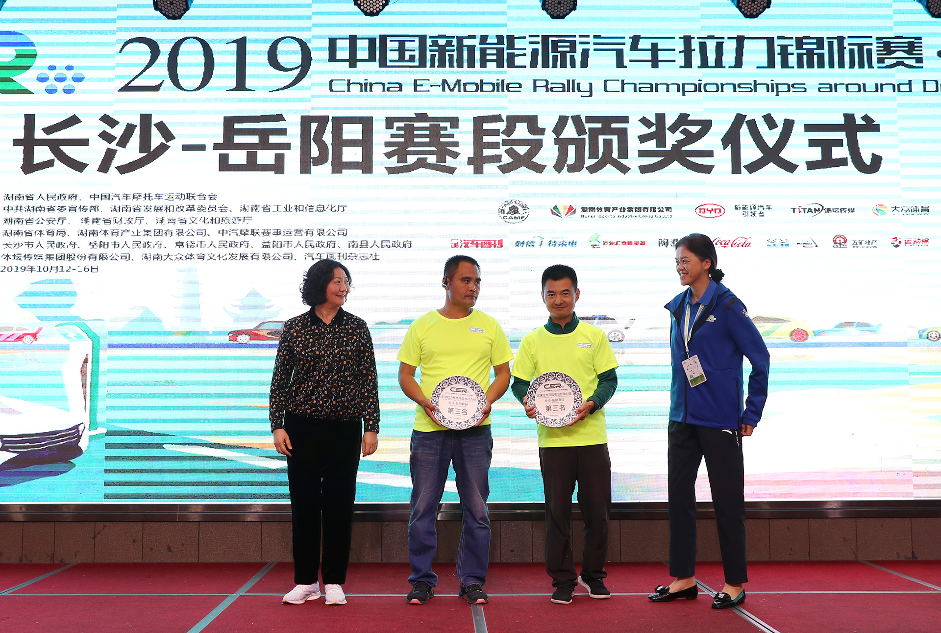 图为长沙至岳阳赛段定速拉力赛混合动力组亚军选手与颁奖嘉宾合影留念。