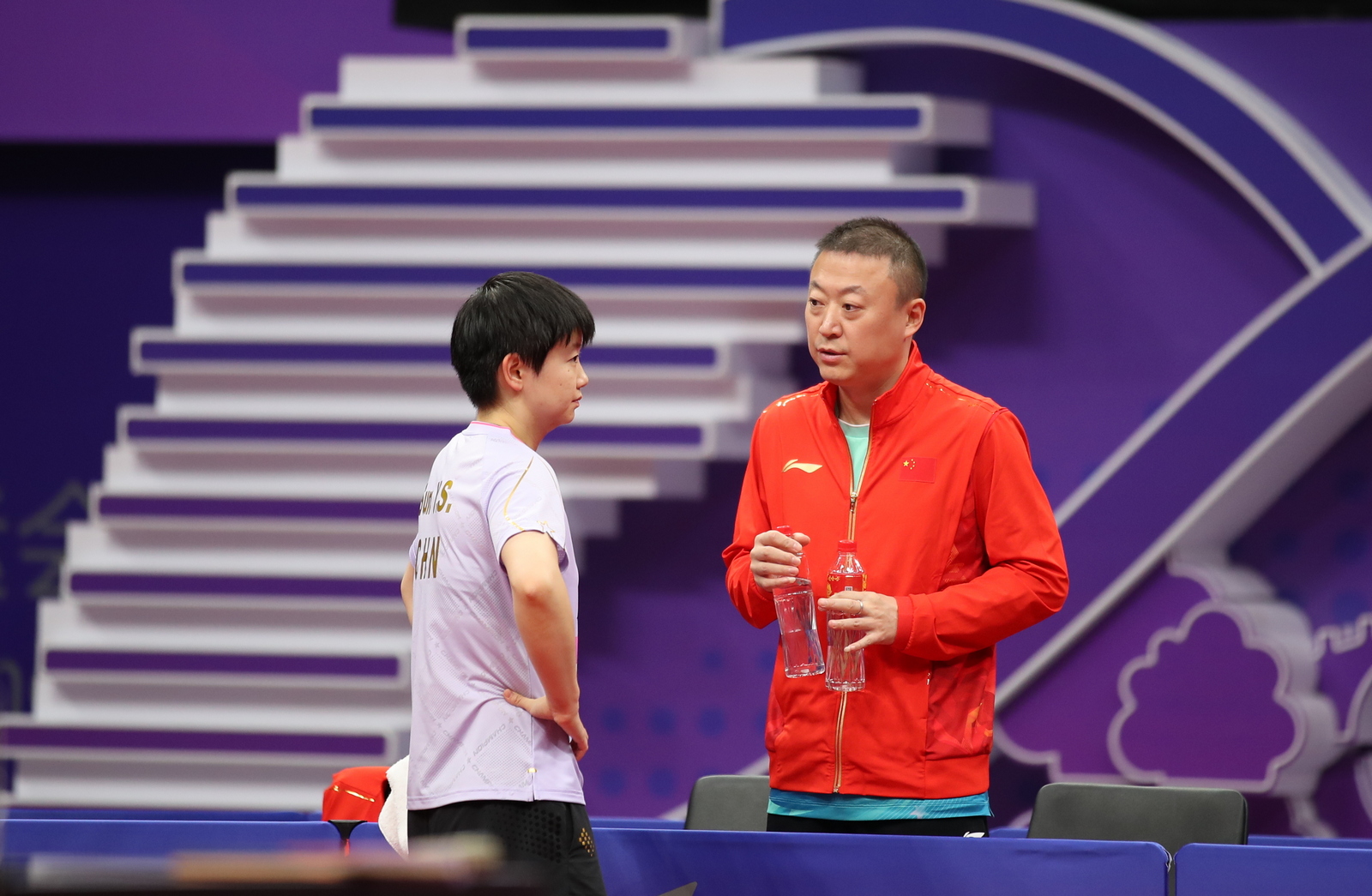 图为中国选手孙颖莎与教练马琳在交流。