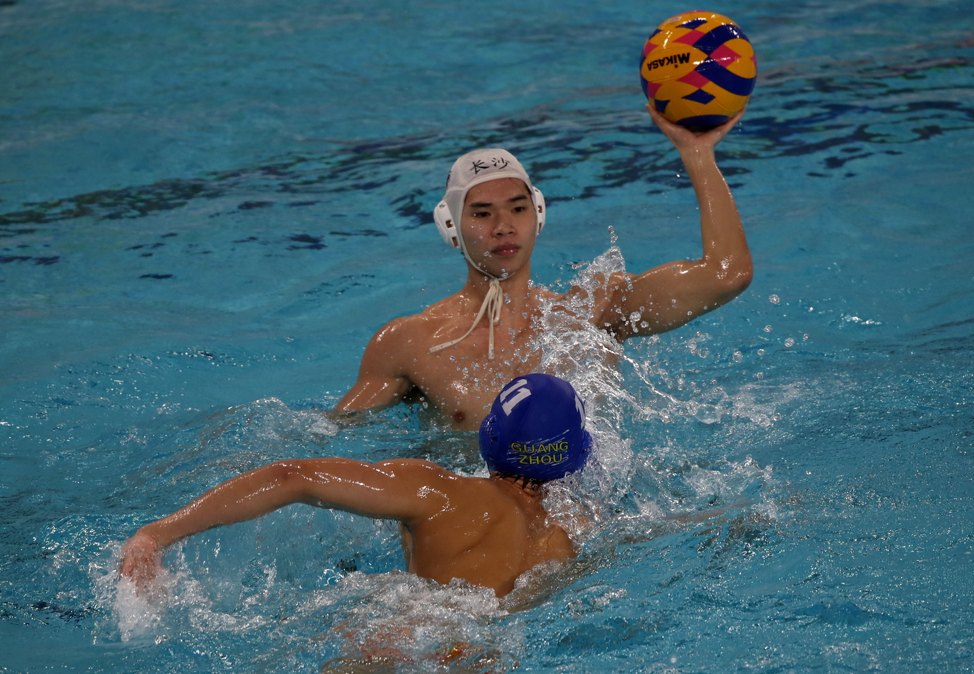 11月13日晚,首届学青会男子水球半决赛在广西南宁市体育运动学校(五合校区)游泳跳水馆举行。