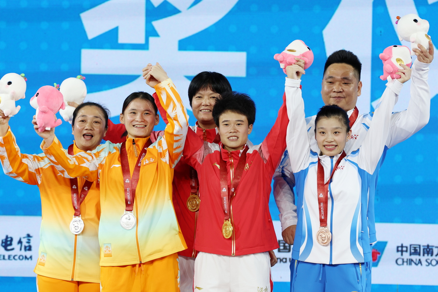11月10日晚,第十五届全国运动会举重女子49公斤级决赛在东莞石龙中学体育馆举行,两届奥运会冠军侯志慧凭借抓举93公斤、挺举110公斤、总成绩203公斤夺得冠军,为体育湘军拿下开幕后的首块金牌。这也是她连续三届全运会夺冠。 图为颁奖仪式现场。