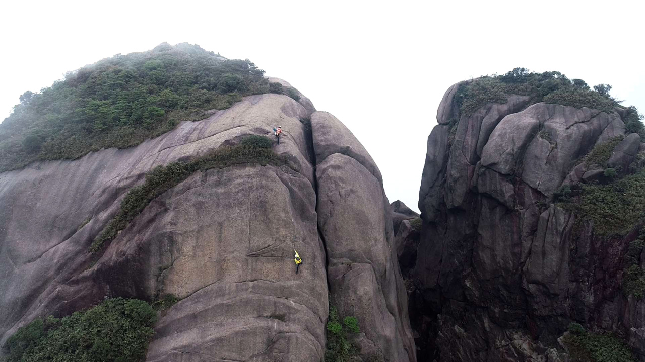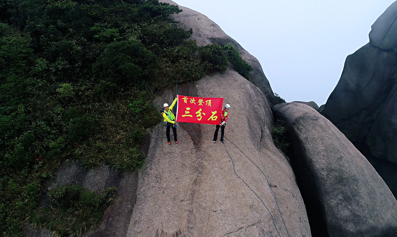 图为2位挑战选手成功攀登三分石顶峰。