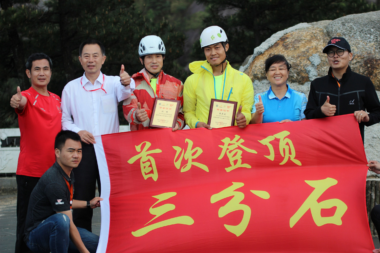 图为大会为首次登顶三分石的挑战者颁发奖牌并合影留念。
