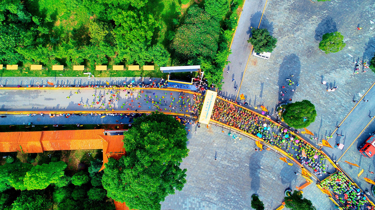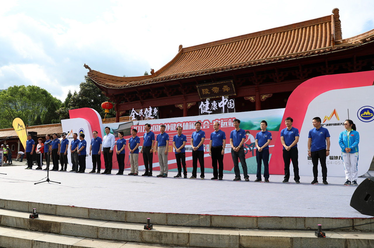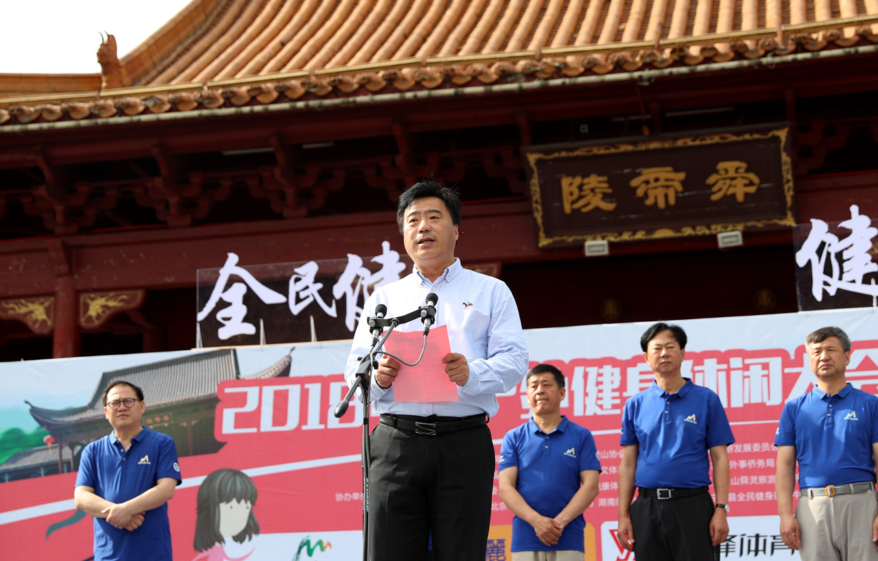 5月5日,2018中国户外健身休闲大会首站在永州宁远县启幕。图为开幕式在舜帝陵广场举行。 潘梁平摄