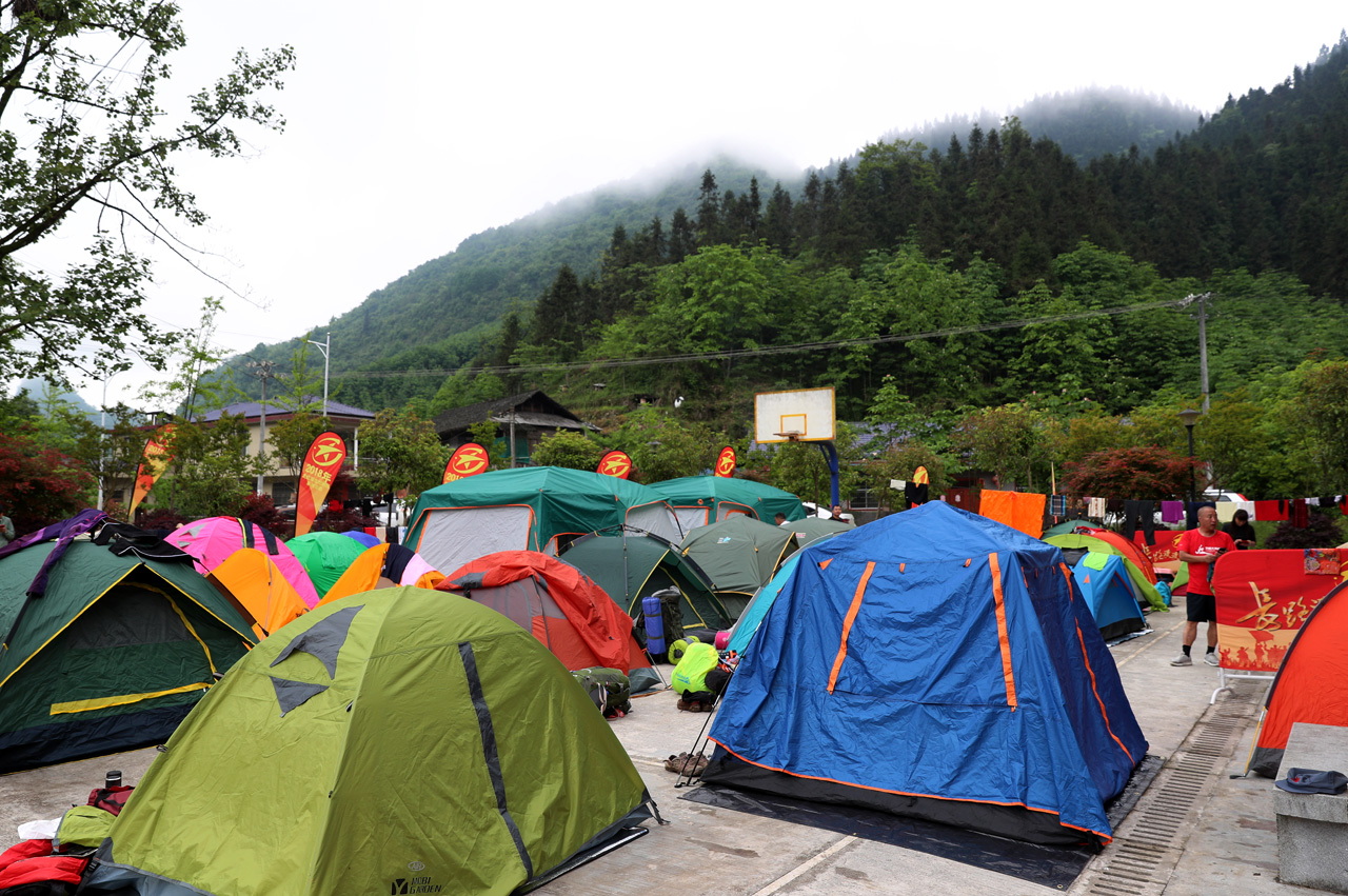 图为选手在露营点搭起了帐篷。