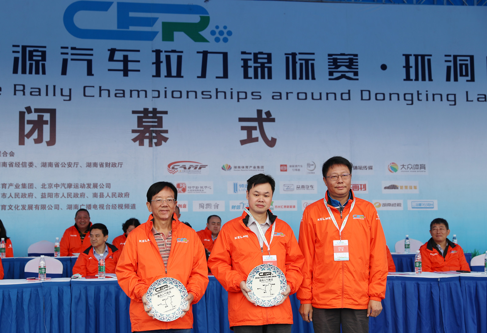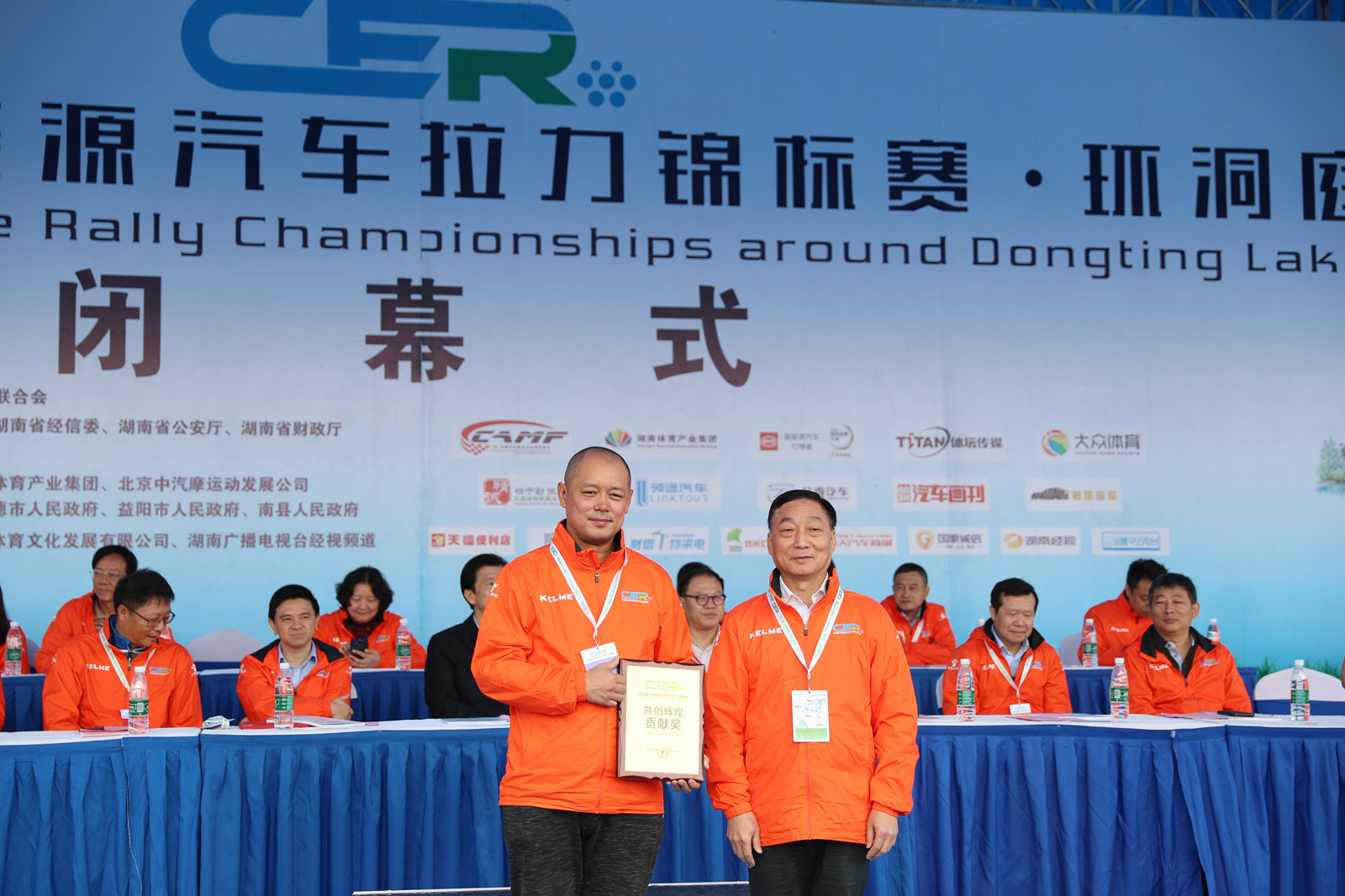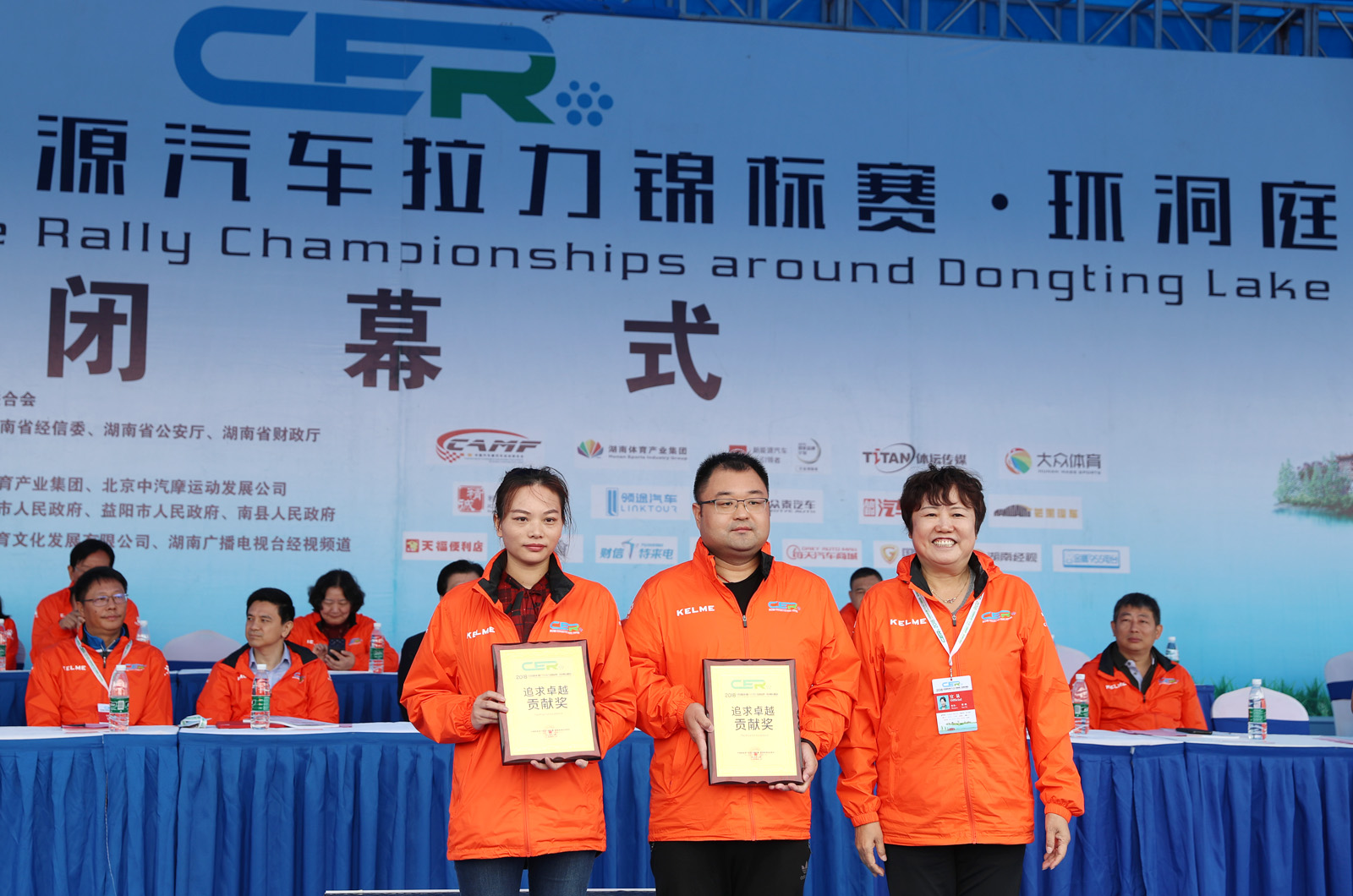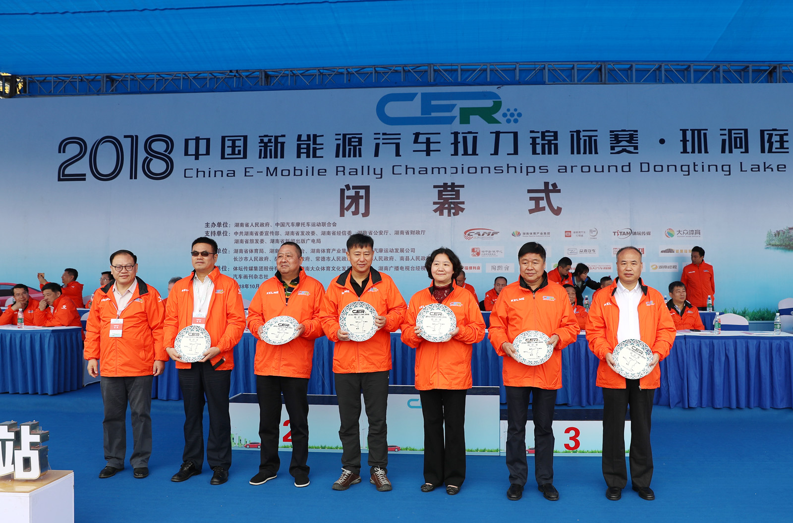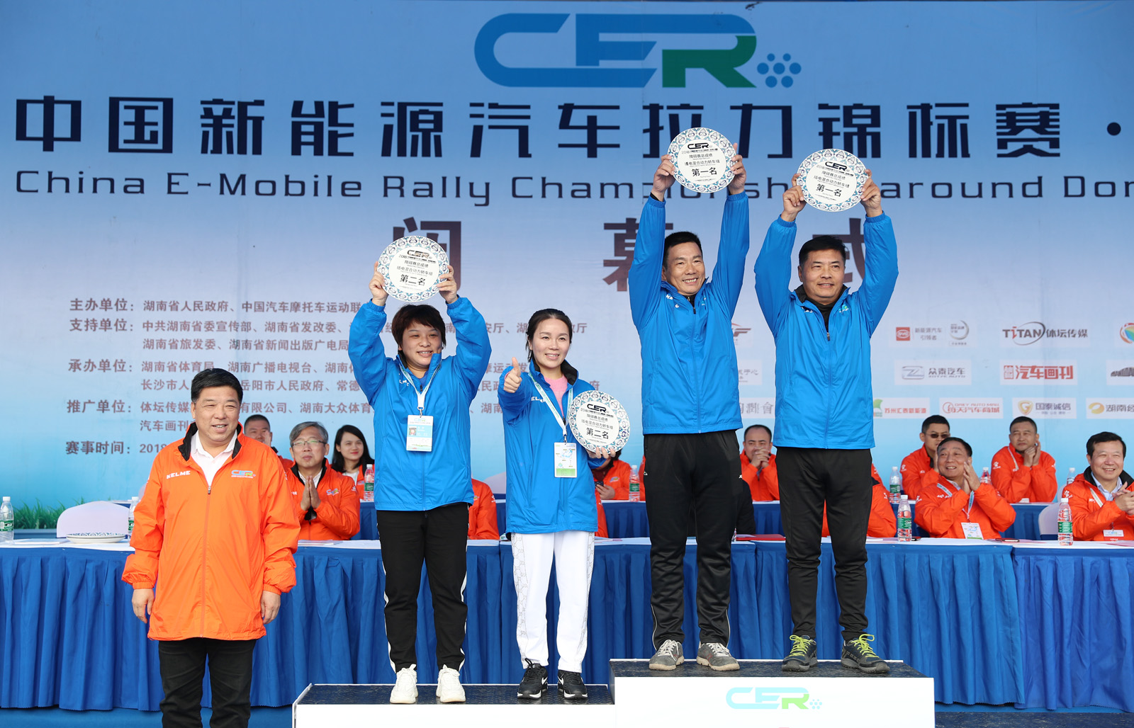 图为湖南省经信委装备工业处副处长彭斌,南县人民政府副县长王裔为获得纯电动组定速拉力赛总成绩前四到八名颁奖。