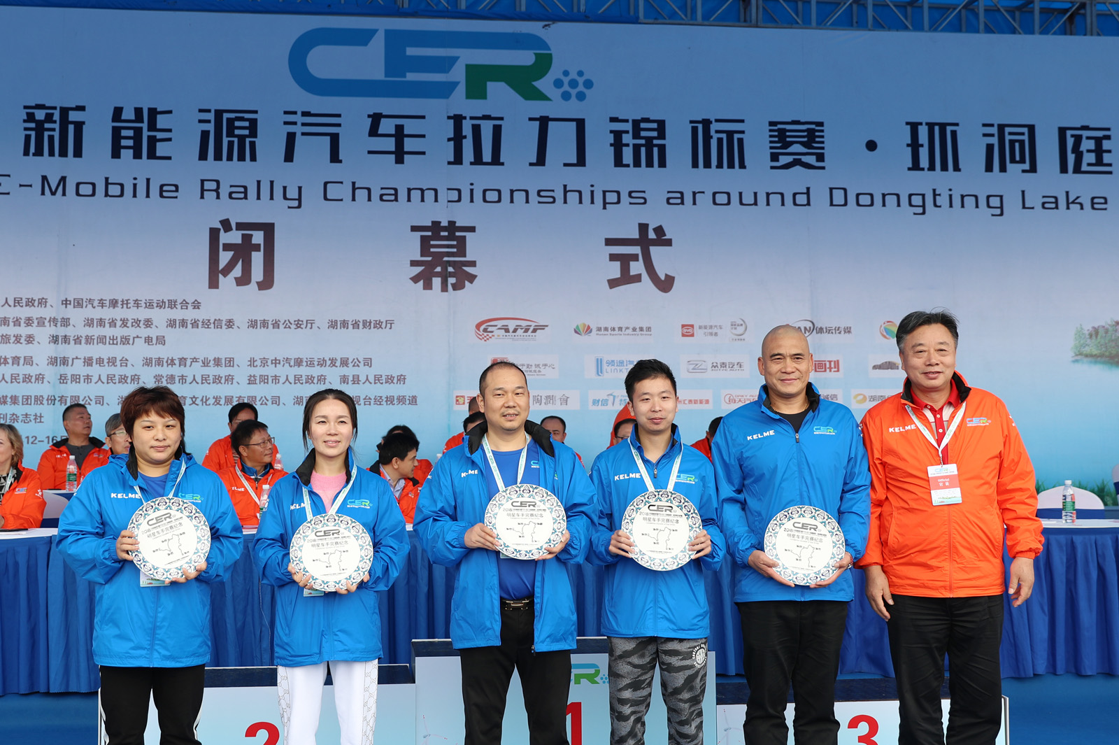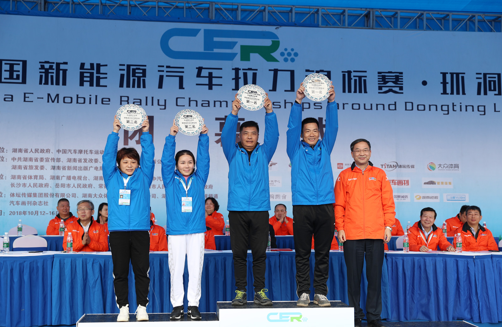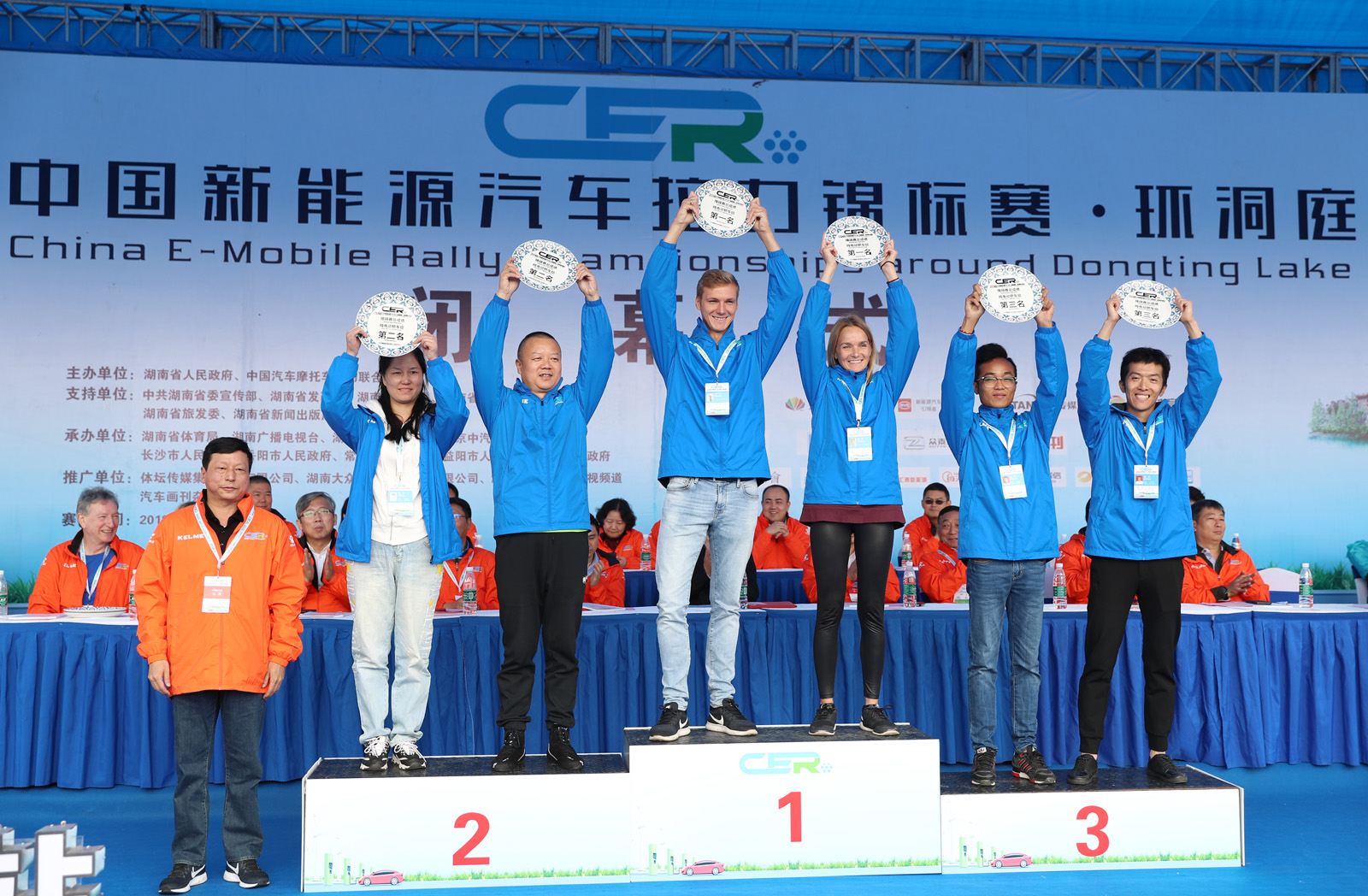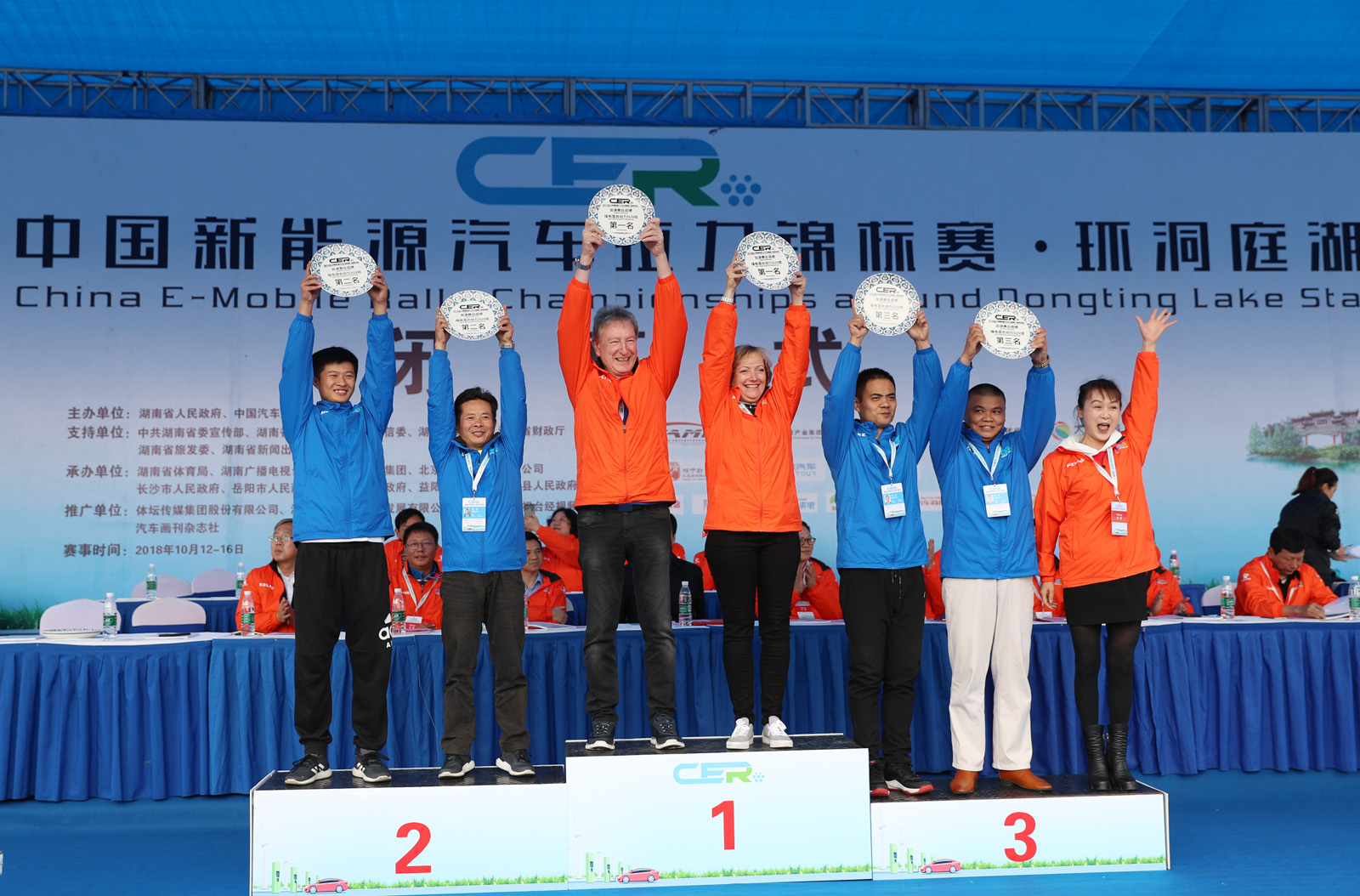 湖南省体育局副局长熊倪(下排中)、众泰新能源汽车有限公司销售中心市场部部长刘志红、领途汽车新能源营销中心总经理助理郭靖为获得纯电动组定速拉力赛总成绩前三名颁奖。