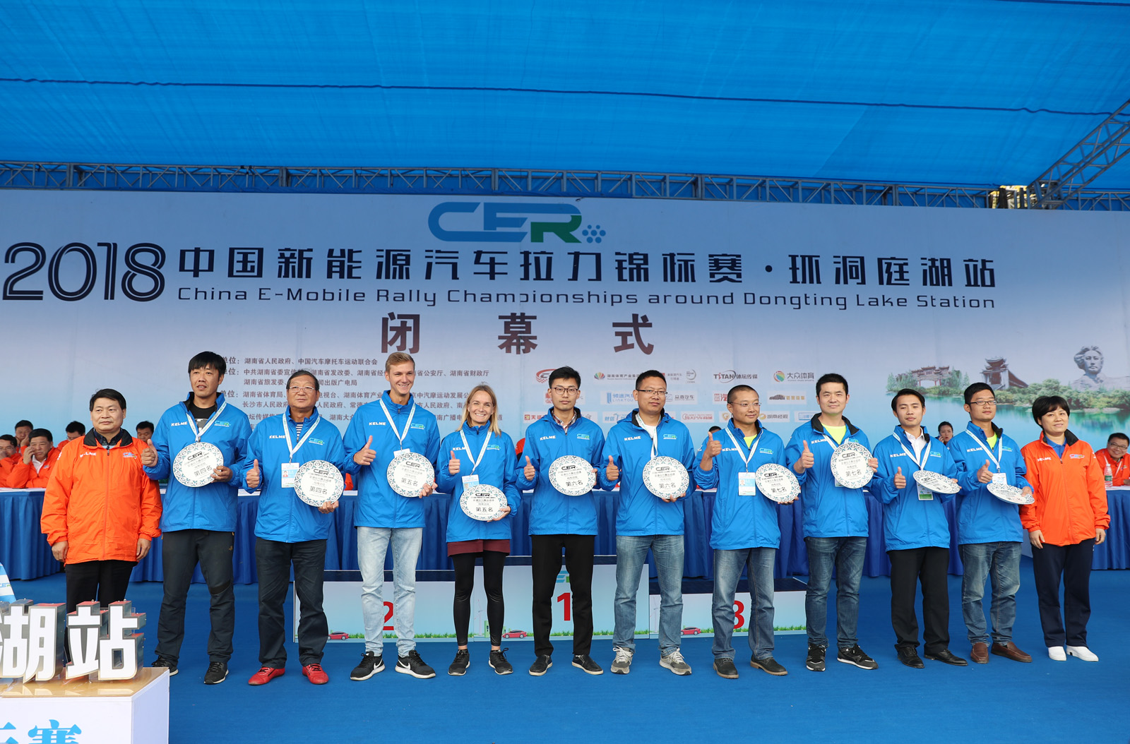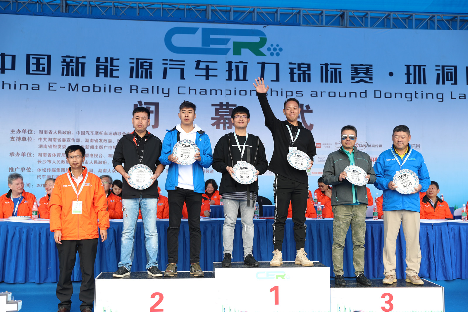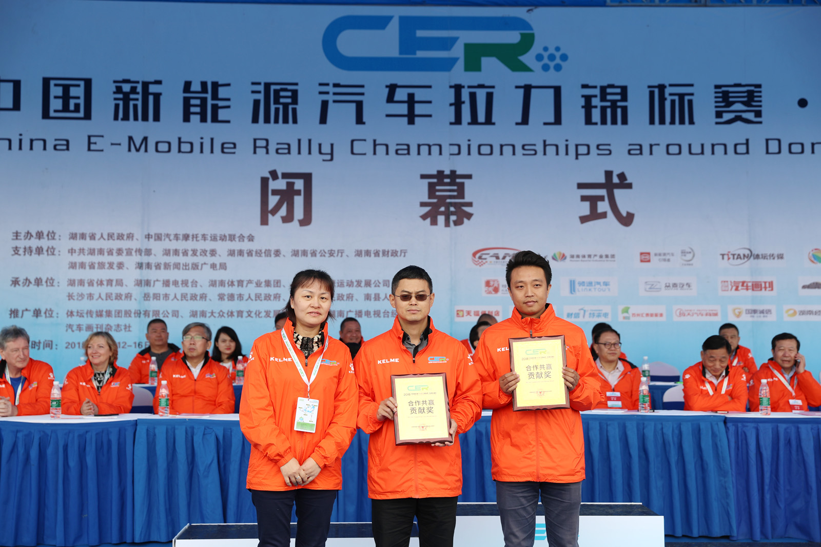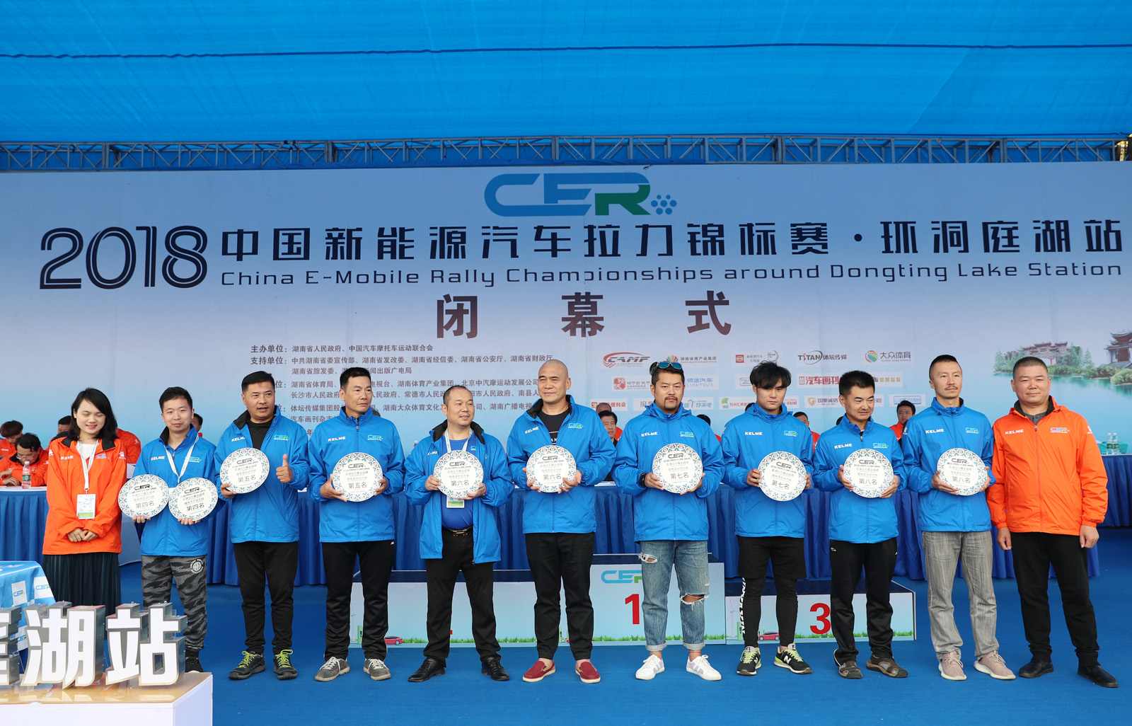 湖南省体育局副局长熊倪(下排中)、众泰新能源汽车有限公司销售中心市场部部长刘志红、领途汽车新能源营销中心总经理助理郭靖为获得纯电动组定速拉力赛总成绩前三名颁奖。