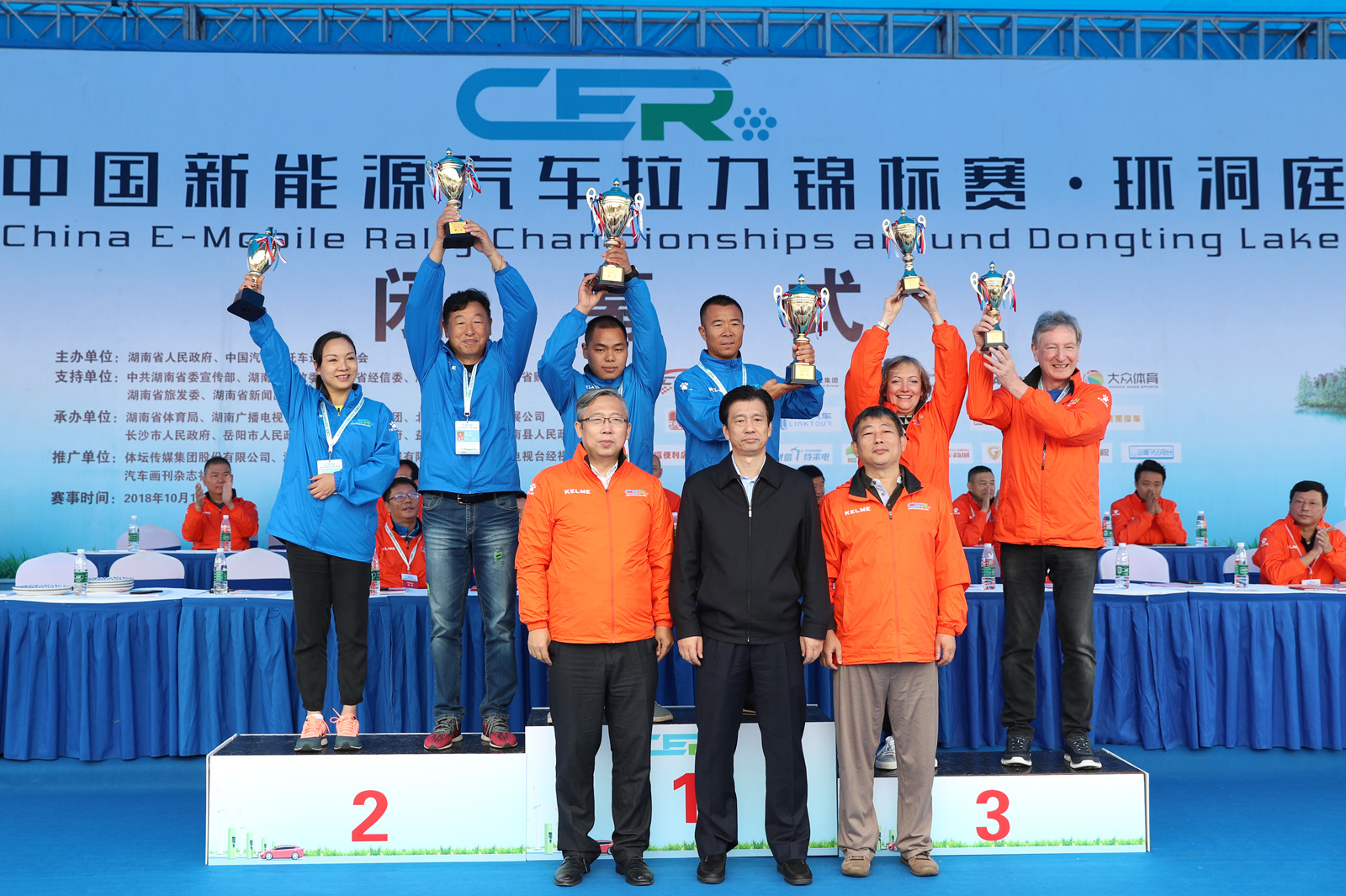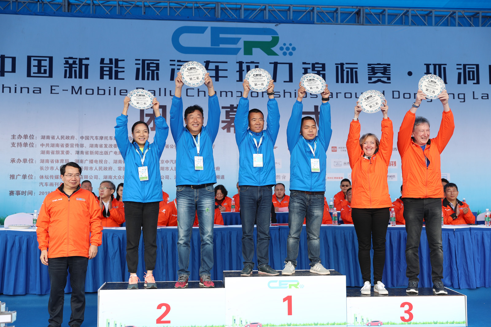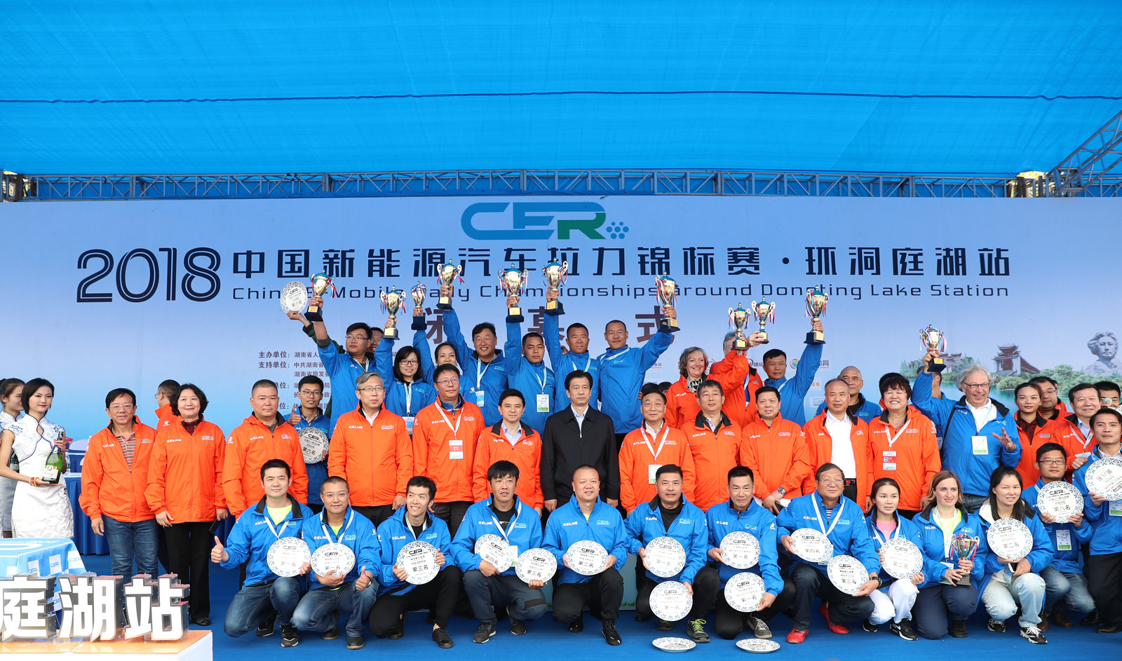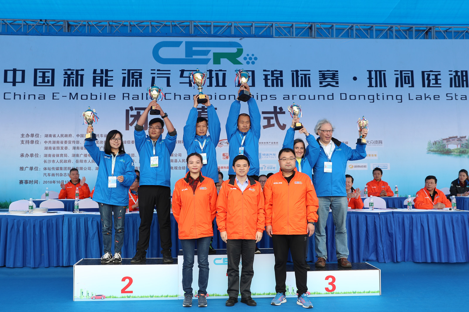 湖南省体育局副局长熊倪(下排中)、众泰新能源汽车有限公司销售中心市场部部长刘志红、领途汽车新能源营销中心总经理助理郭靖为获得纯电动组定速拉力赛总成绩前三名颁奖。