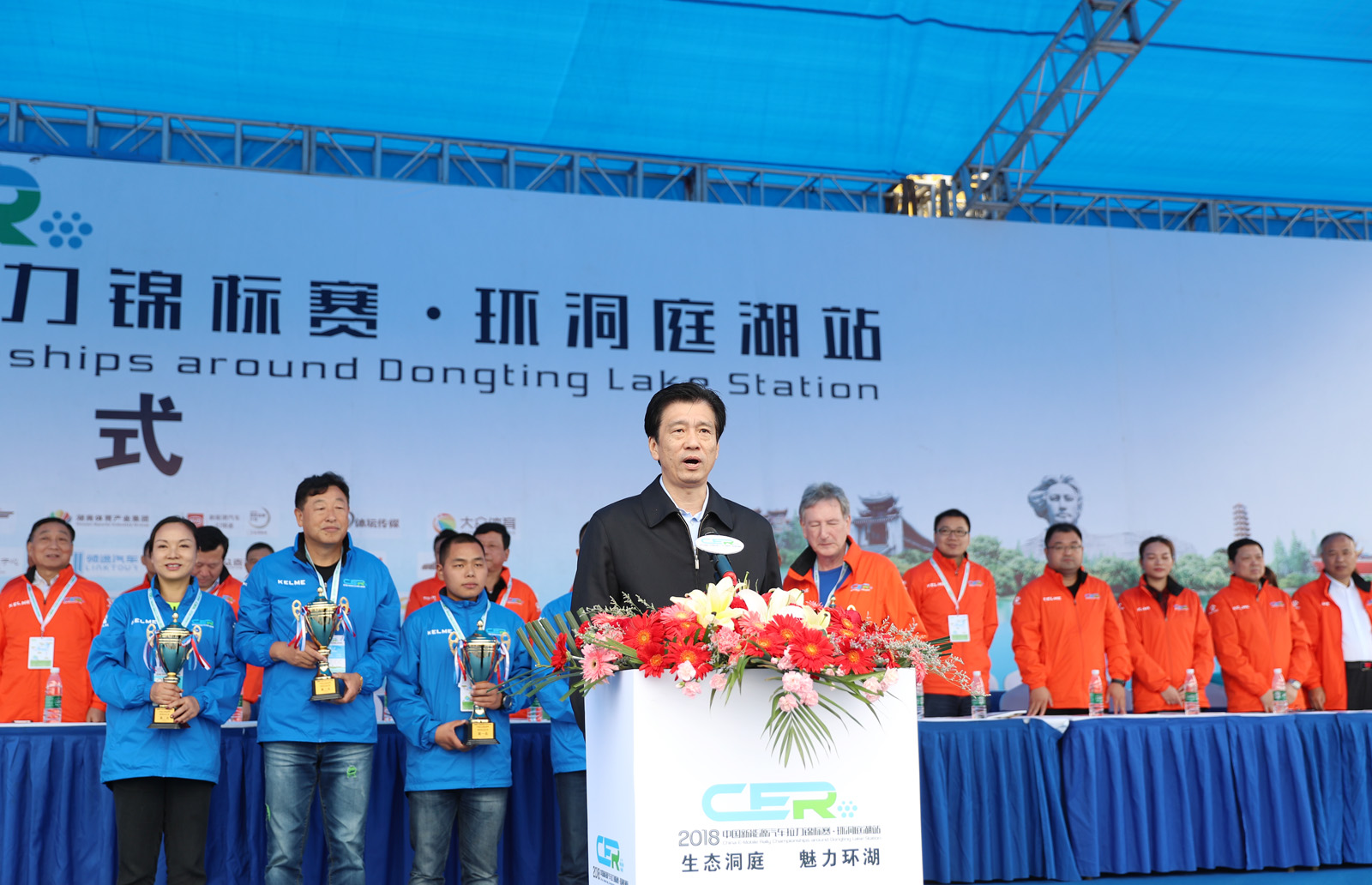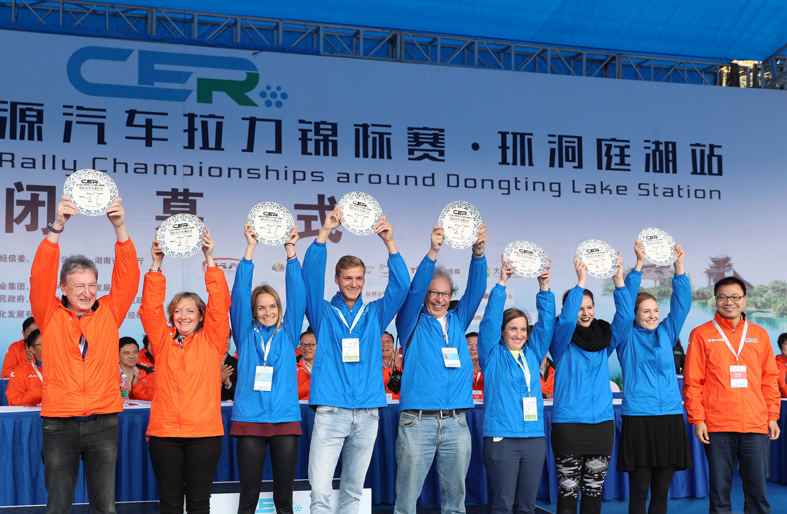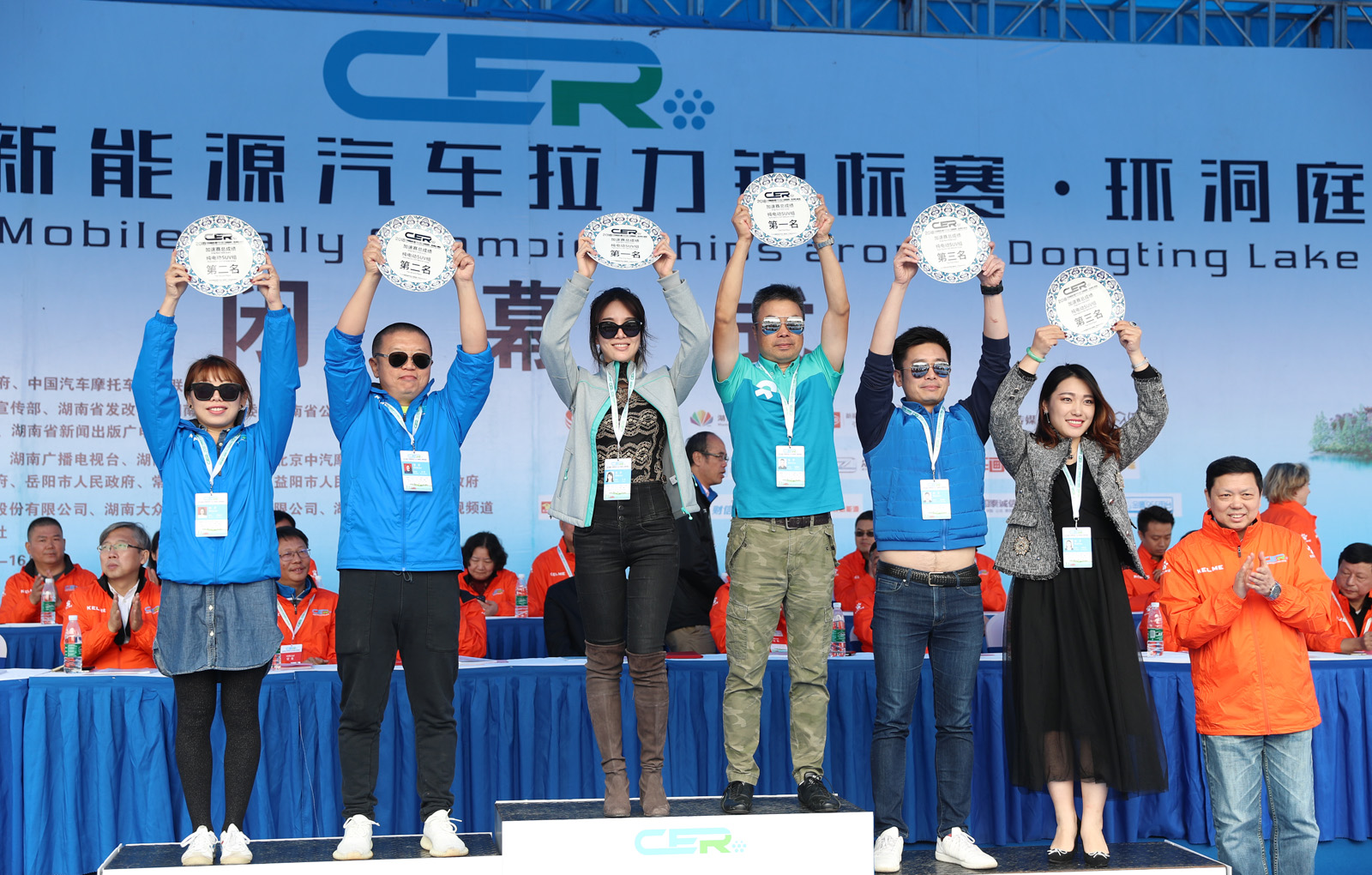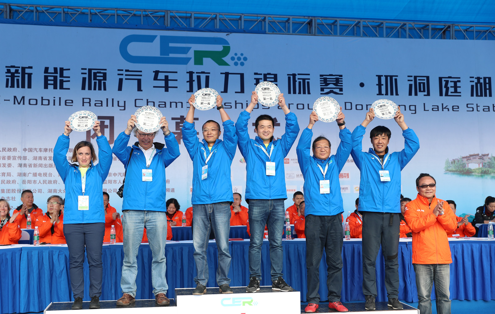 湖南省体育局副局长熊倪(下排中)、众泰新能源汽车有限公司销售中心市场部部长刘志红、领途汽车新能源营销中心总经理助理郭靖为获得纯电动组定速拉力赛总成绩前三名颁奖。