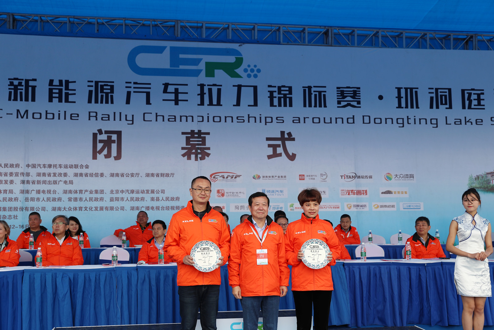 图为体坛传媒股份有限公司副总经理易文迪,省发改委能源局电力处充电桩负责人危丽芳为获得混合动力组定速拉力赛总成绩四到八名颁奖。
