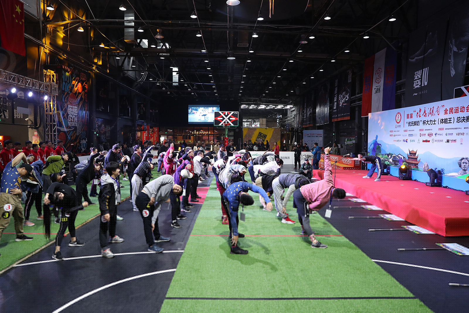 图为运动员赛前热身运动。