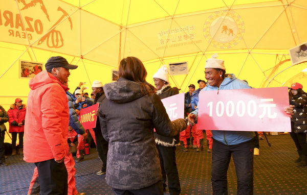在珠峰大本营的球形帐篷里,王德军带领现场全体党员重温入党誓词。随后,中国登山队、国测一大队、新闻媒体界、西藏拉萨喜马拉雅登山向导学校分别向驻西藏日喀则市定日县岗嘎镇古热村、辖龙村、孔目村、沃嘎村4个驻村点捐赠扶贫资金一万元,推动山峰所在地村庄的经济发展。(文/史卫静图/卢明文)